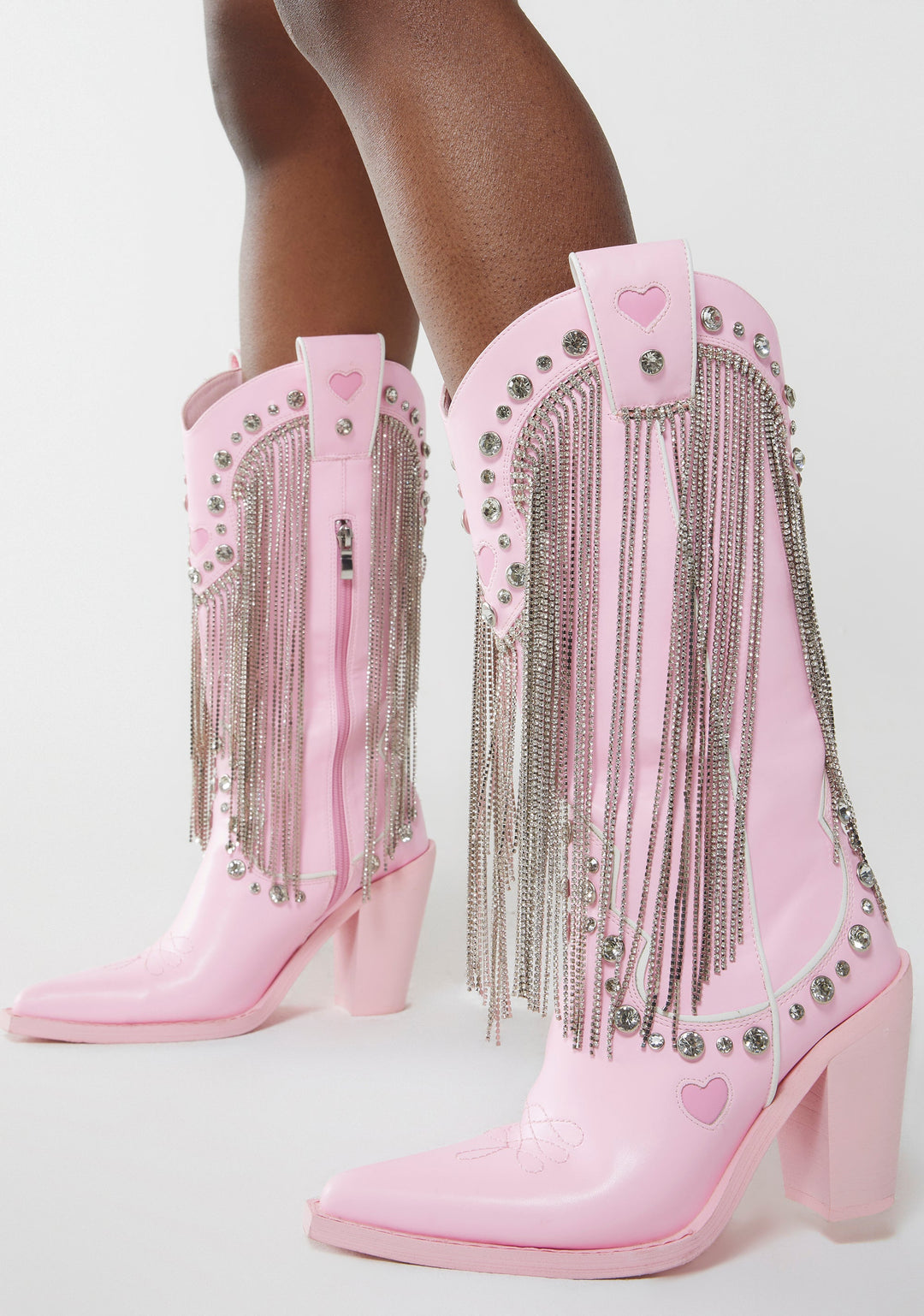 cuz bless your heart. These cowboy boots have a vegan leather construction, rhinestone fringe detailing, jewel studs, and side zipper closures.
