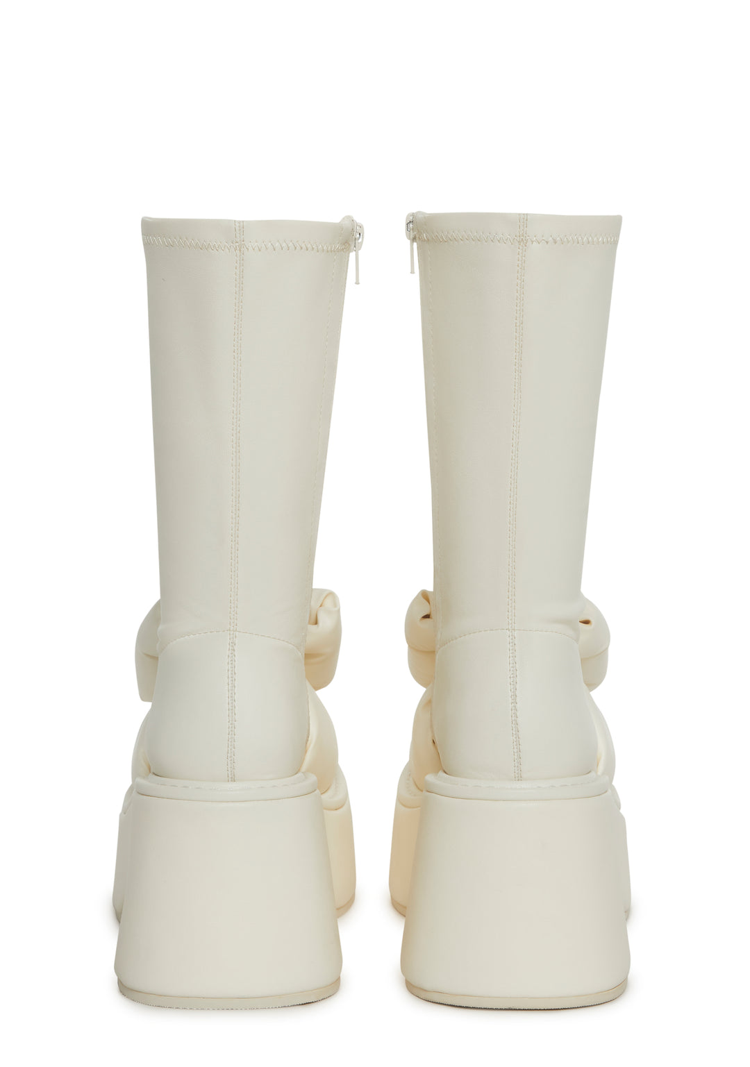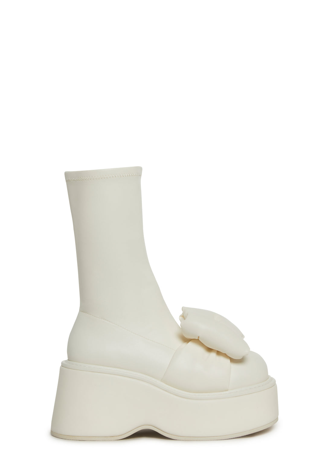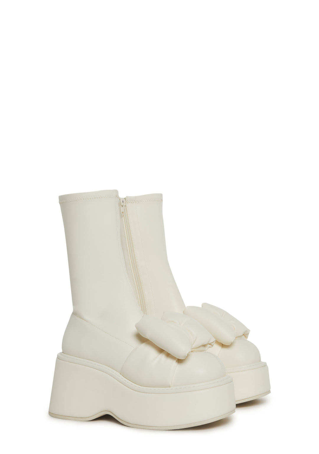 These booties have a vegan leather construction with a puffy bow applique on top, a platform sole, a stretchy paneled design, and a side zipper closure.