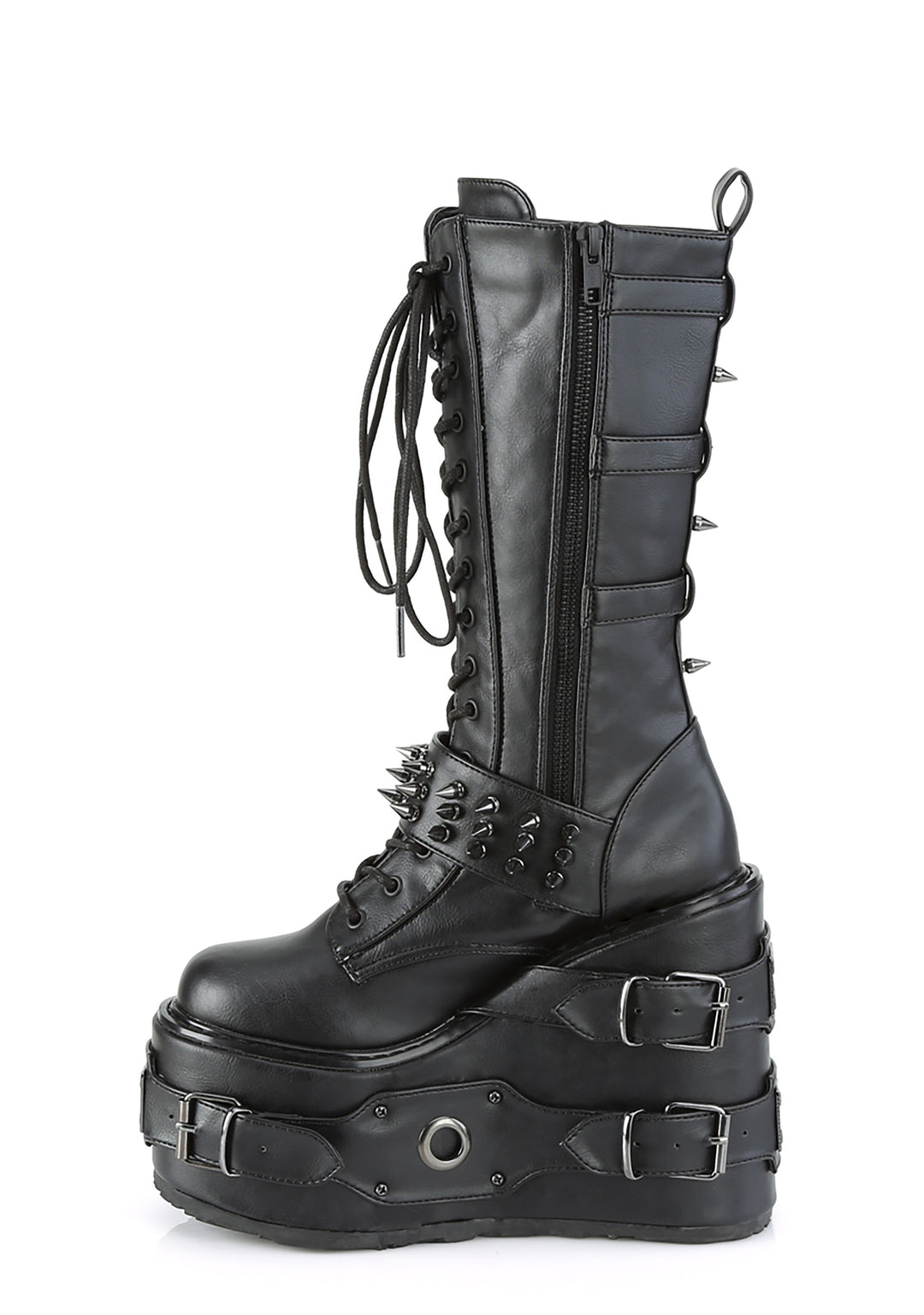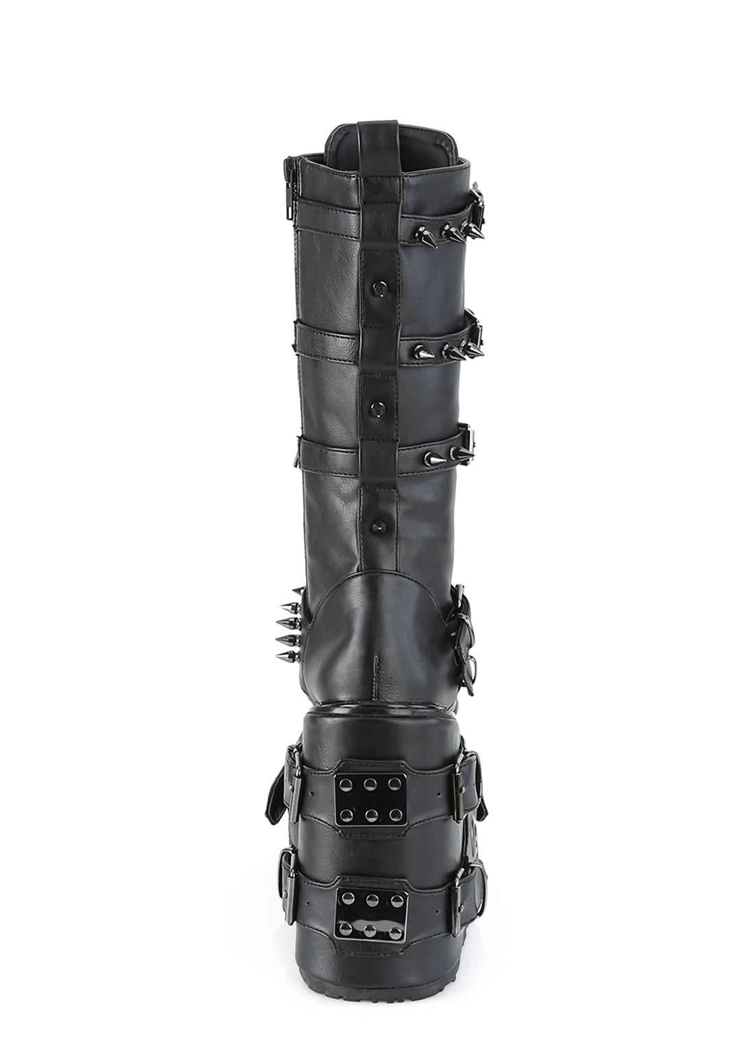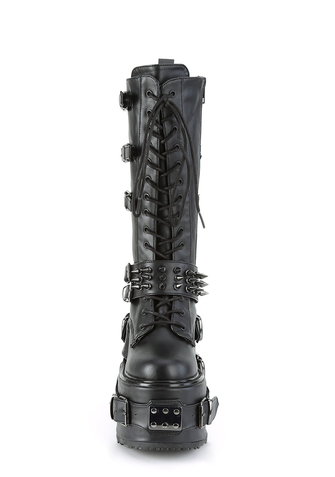 cuz you’ll always stay brutal. These calf high combat boots have a vegan leather construction, thick platform soles with metal plated hardware, spike studded buckle straps, adjustable laces and side zip closures.