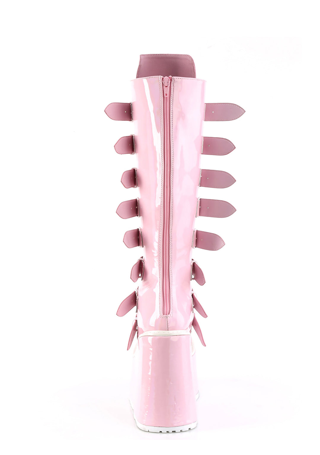 cuz you’re from a different planet. These knee high platform boots have a holographic vegan leather construction, tons of adjustable buckle straps with metal plate details, and back zip closures.