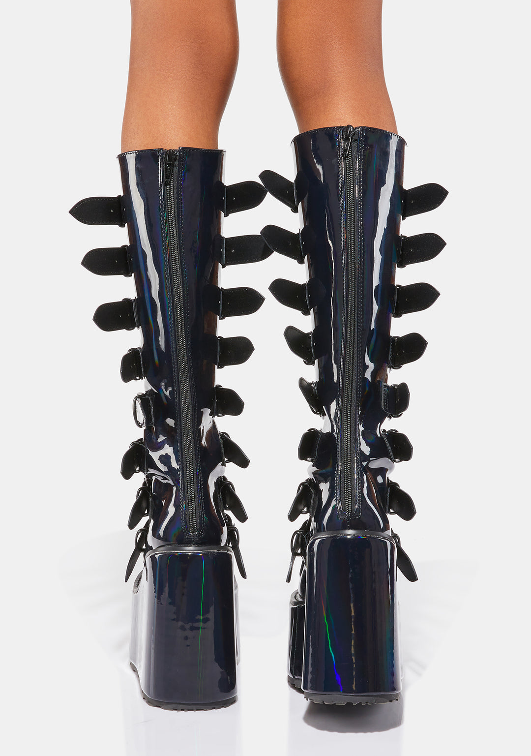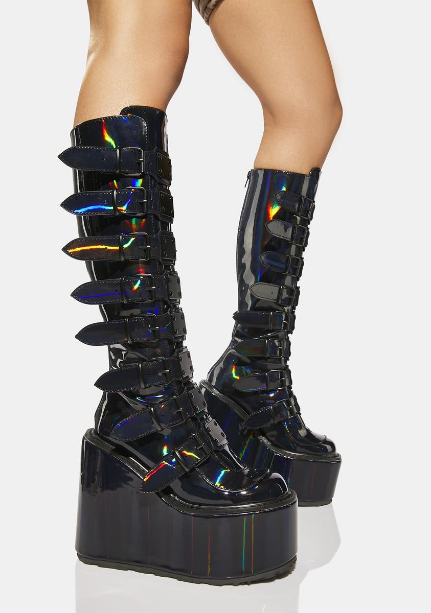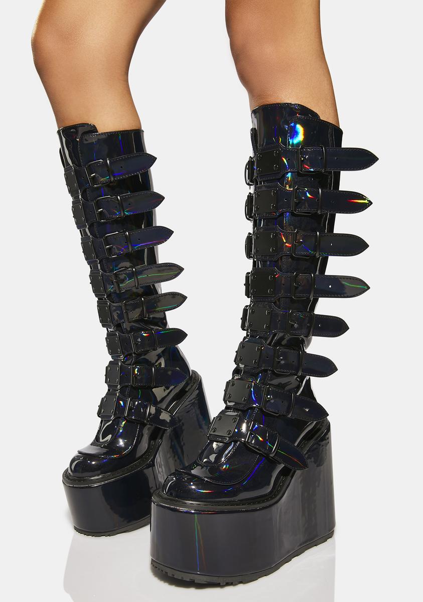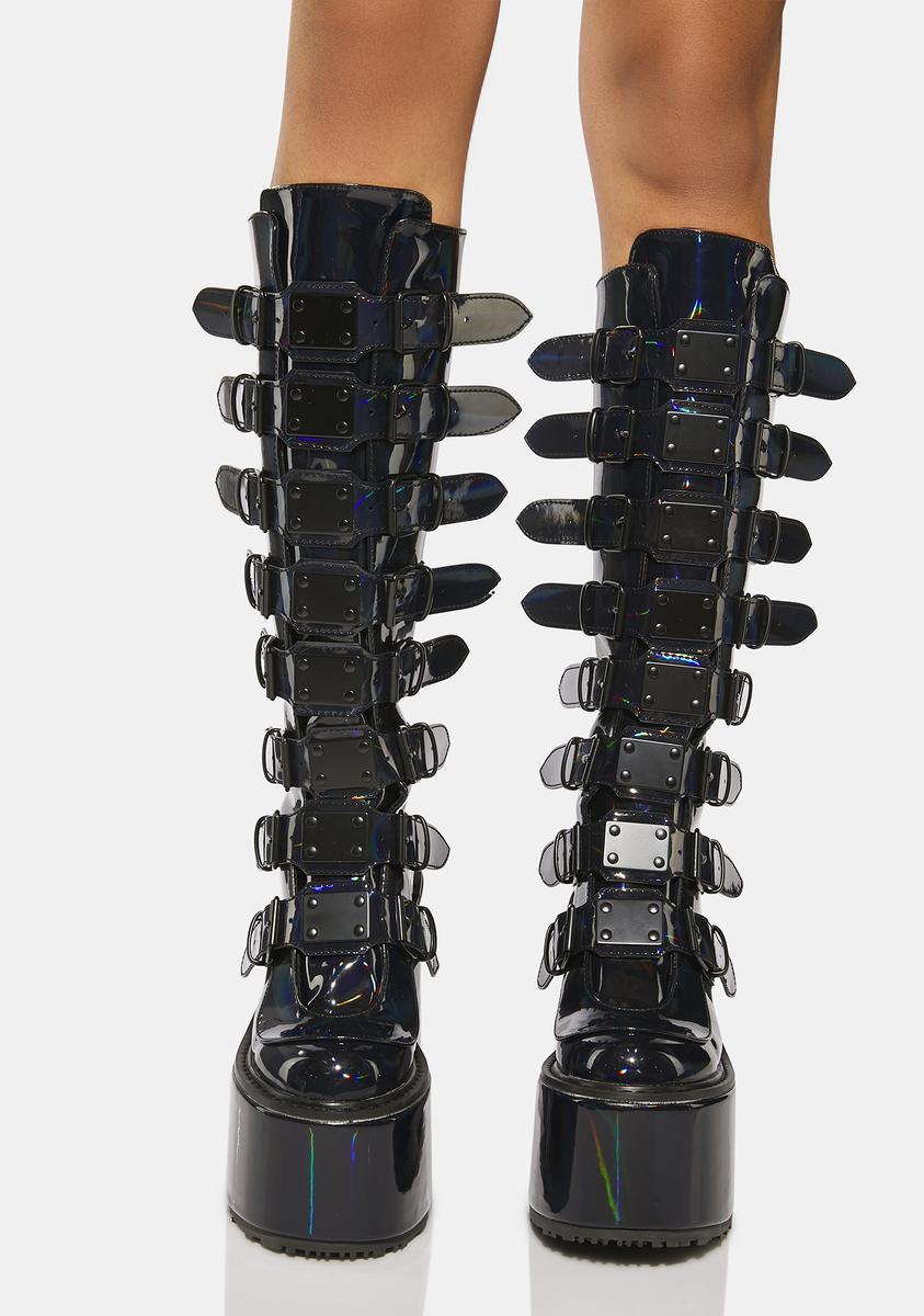 cuz you’re from a different planet. These knee high platform boots have a patent vegan leather construction with a holographic finish, tons of adjustable buckle straps with metal plate details, and back zip closures.