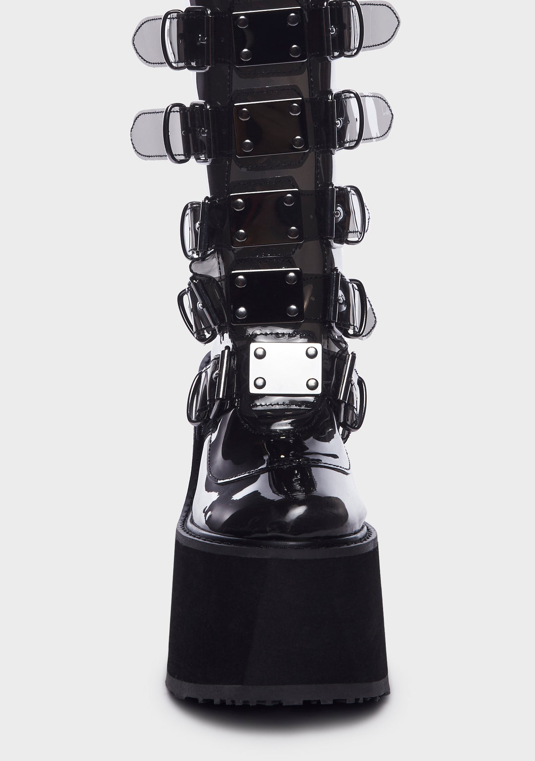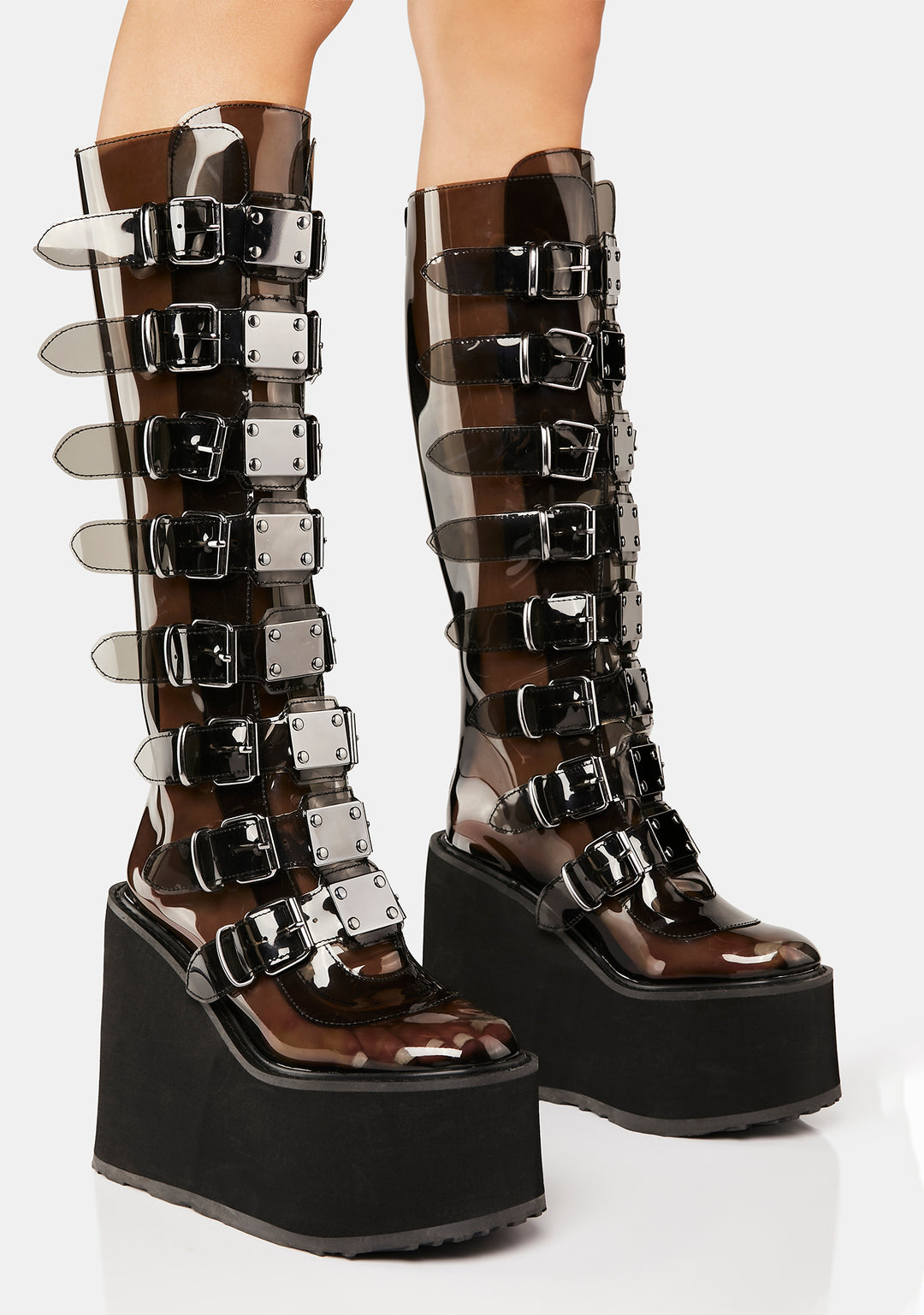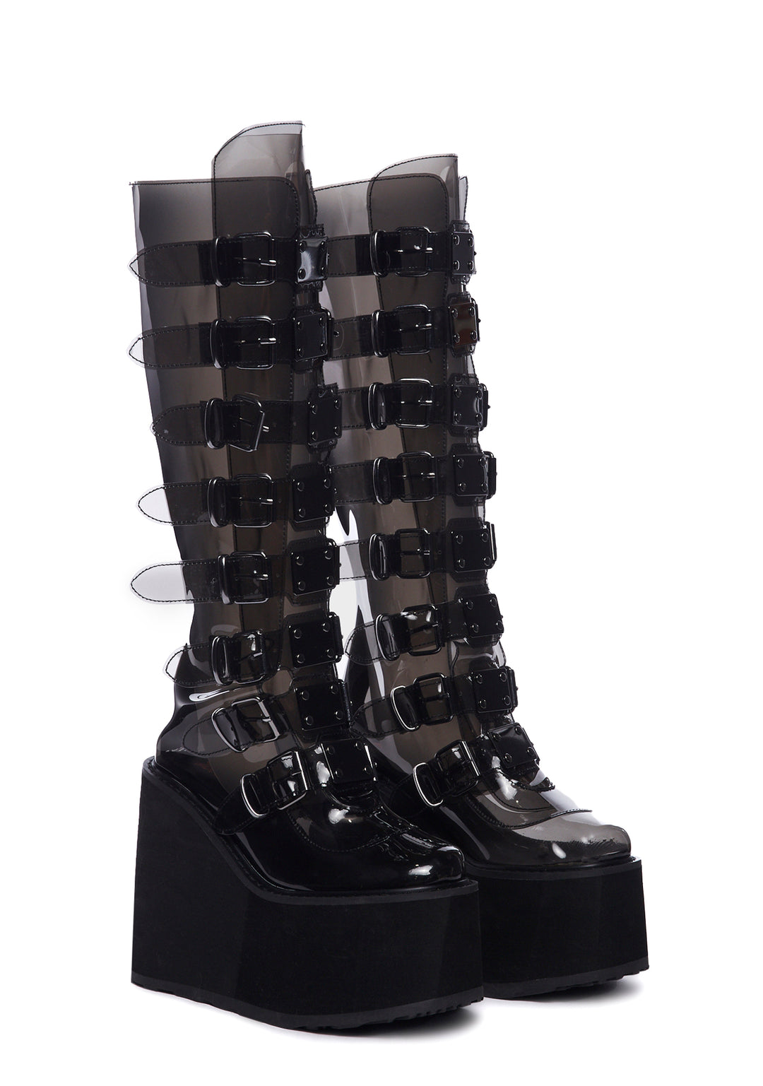 cuz you’ll fuel their robot hearts, babe. These knee high platform boots have a clear smoke vinyl construction, tons of adjustable buckle straps down the front with metal plates, and back zip closures.