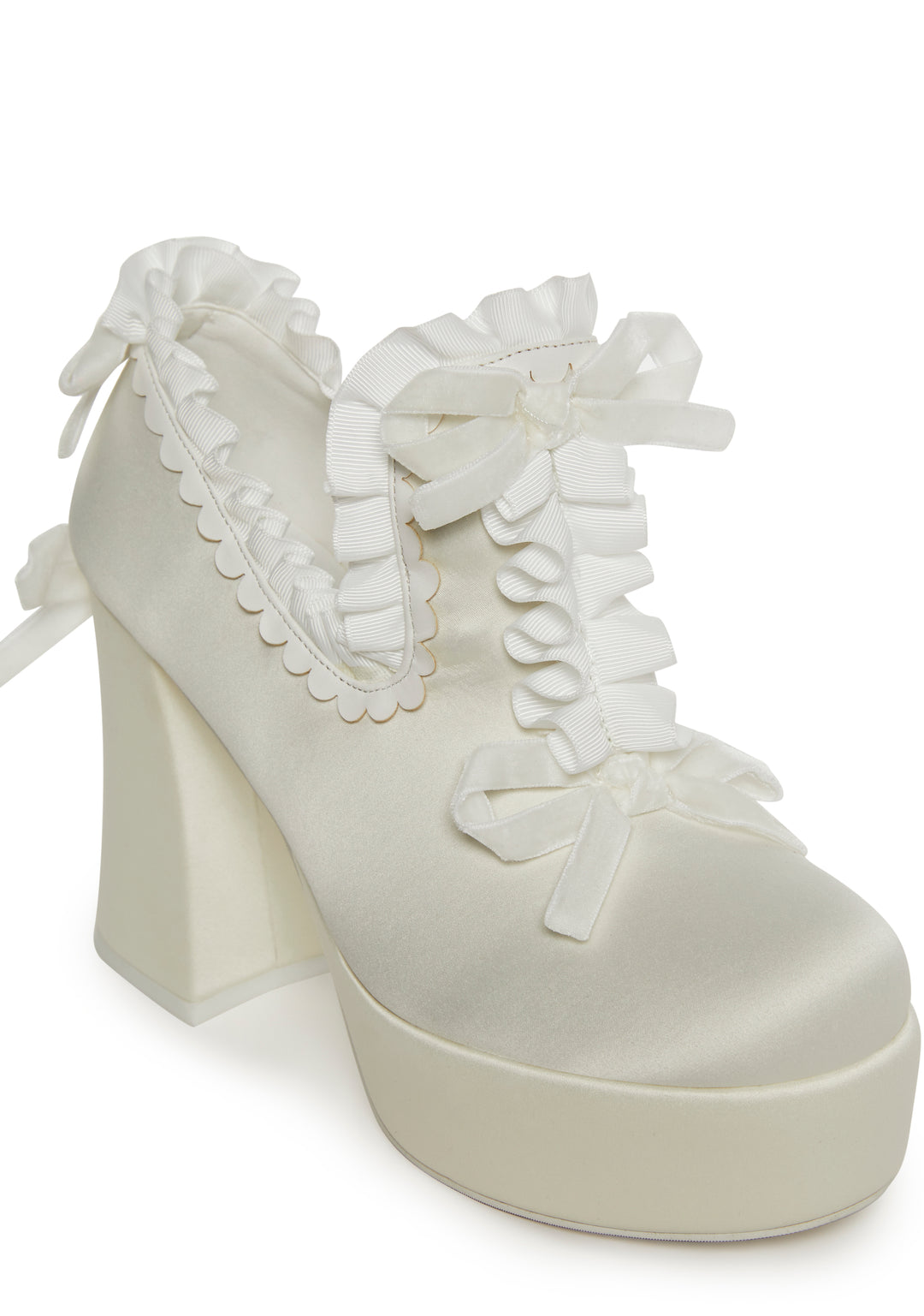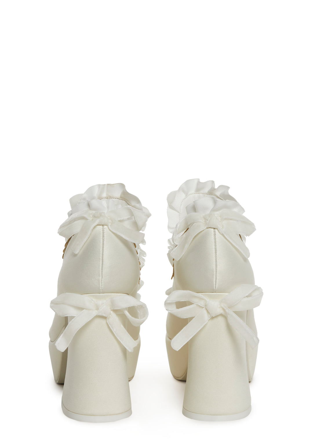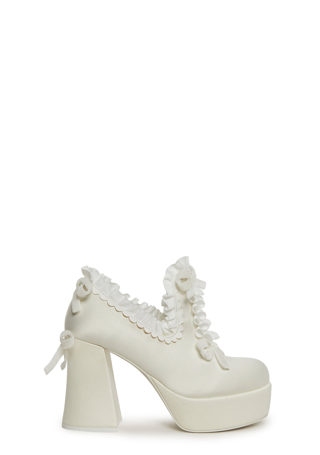 More is always more, so add some extra flair to your outfit with these statement slip on heels that have ruffle trim all over, bow accents, and thick block heels.