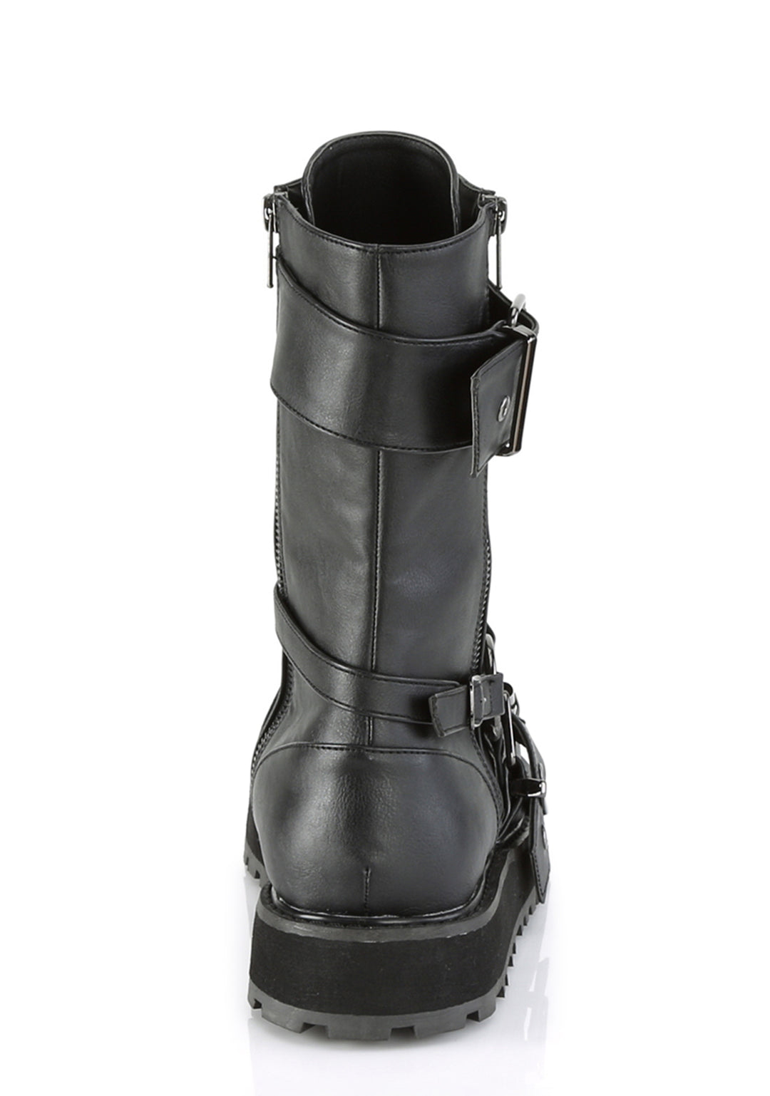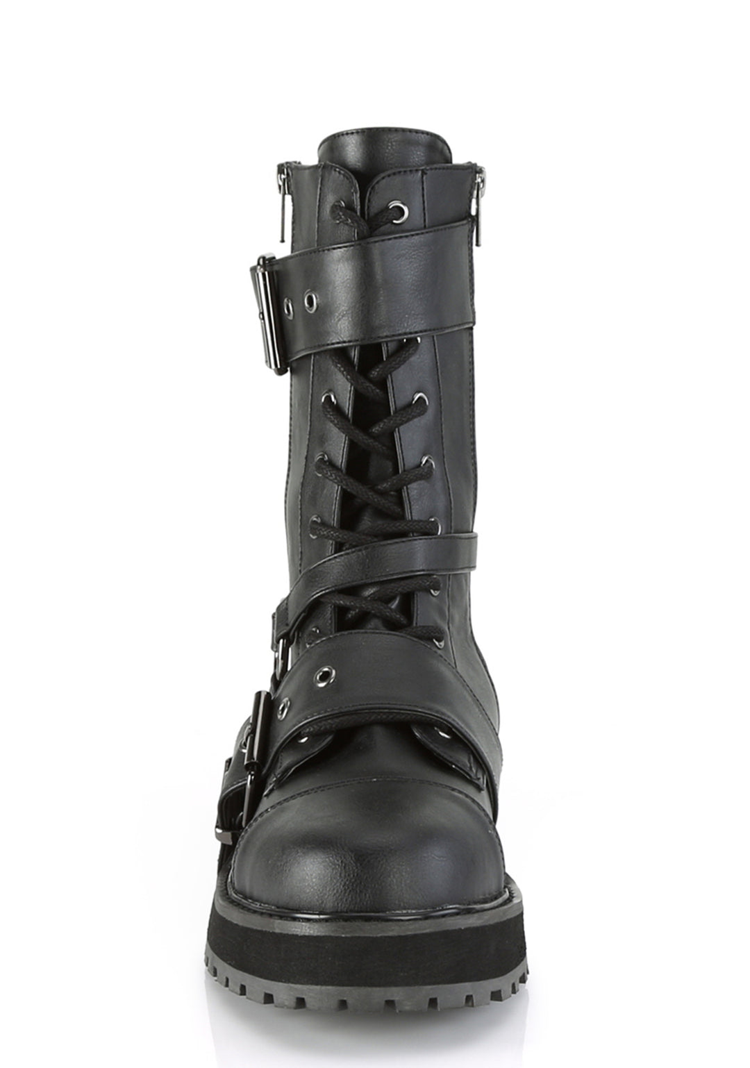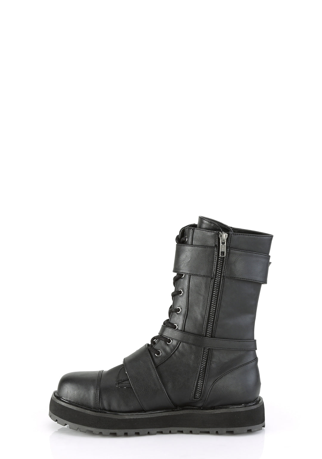These boots have a vegan leather construction, harness straps, O-ring hardware, front lace-ups and side zipper closures.