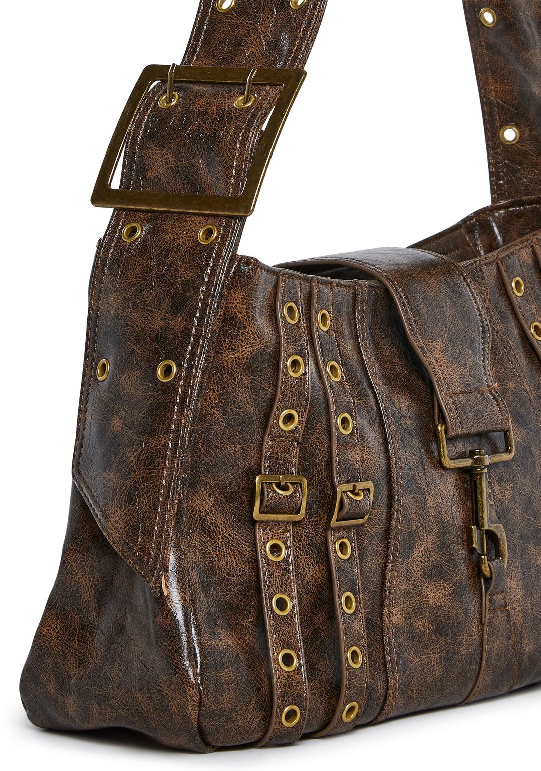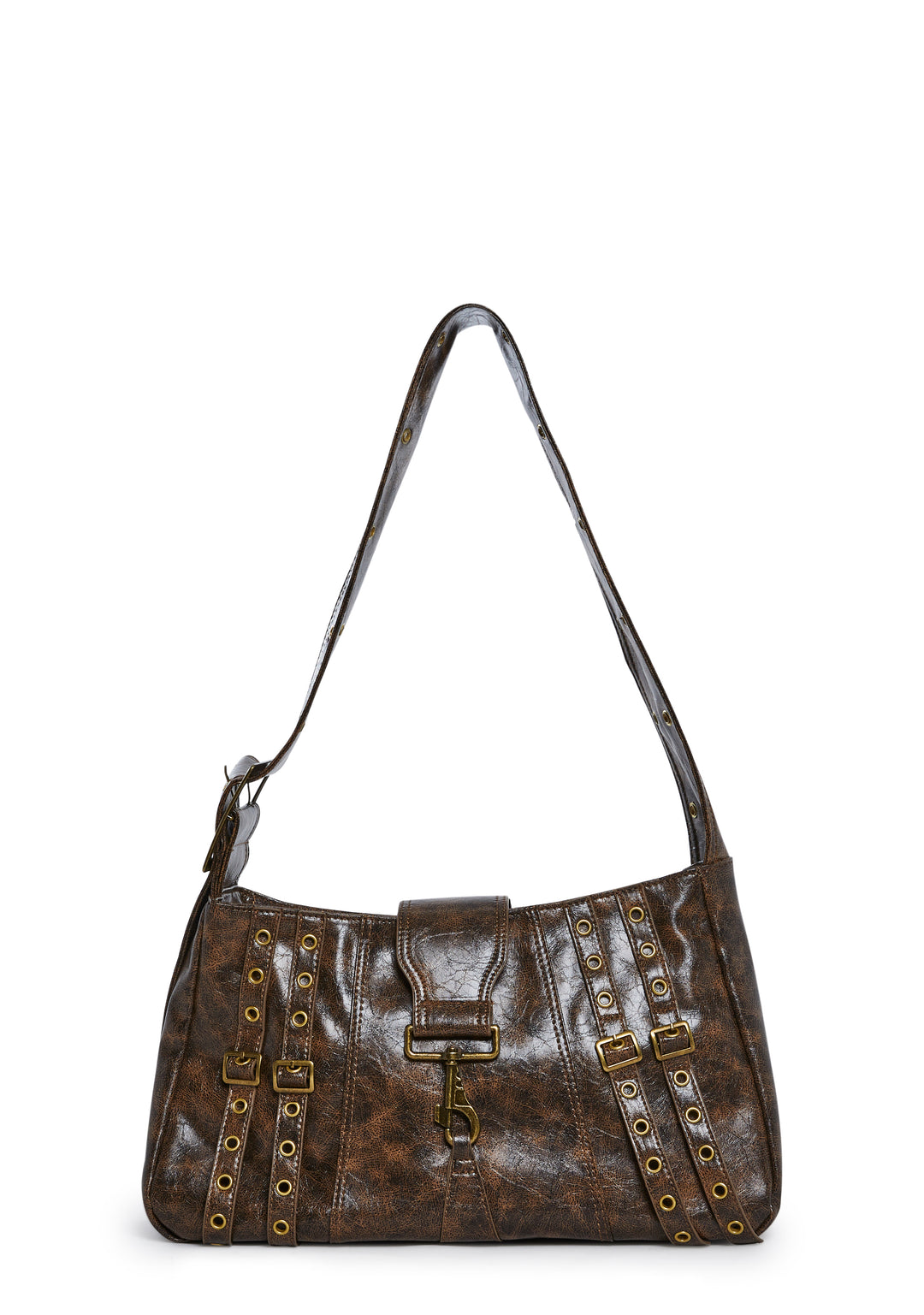 This shoulder bag has a smooth vegan leather construction, an all over animal print, multiple buckle details, an adjustable buckle shoulder strap, and a top zipper and flap key ring closure.