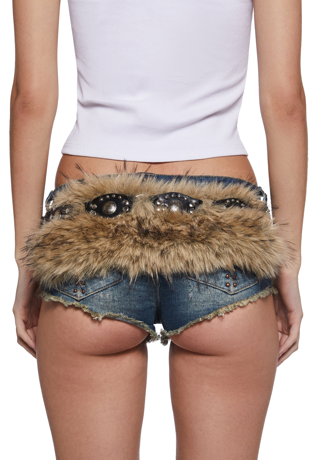 This belt has a vegan leather construction, stud details, O-ring hardware, a faux fur trim on the back, and adjustable buckle belt closure.