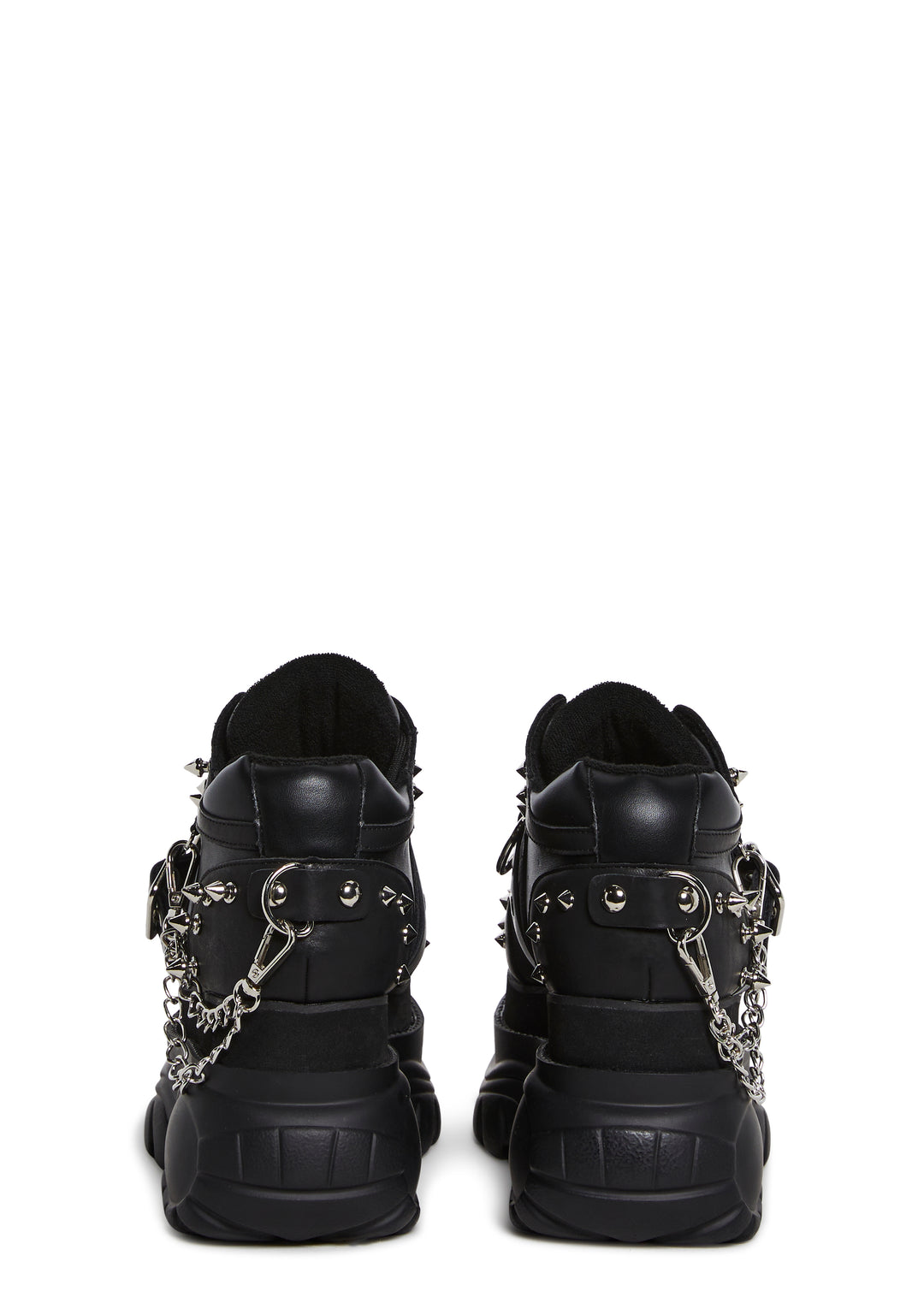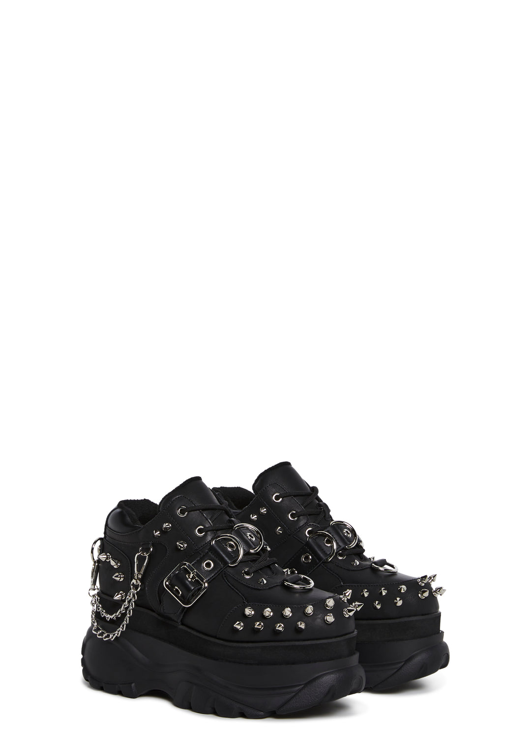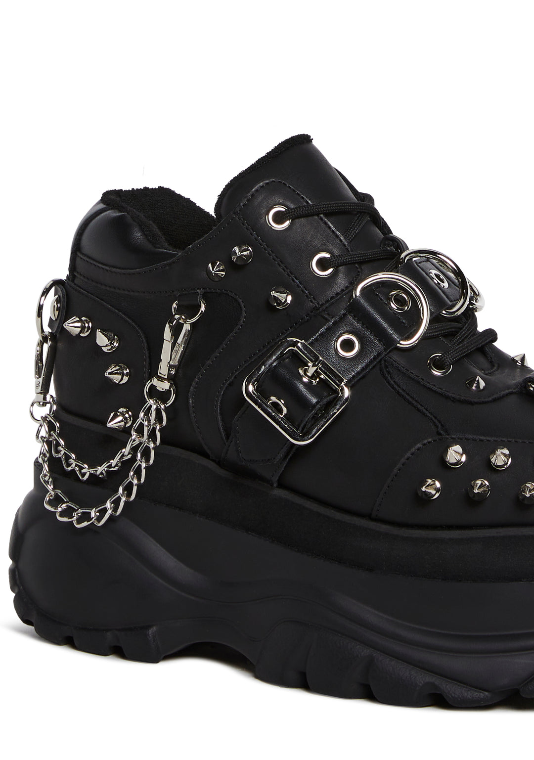 These sneakers have a vegan leather construction, platform soles, spiked details, D-ring hardware, buckles, lace-ups, and removable chainlinks.