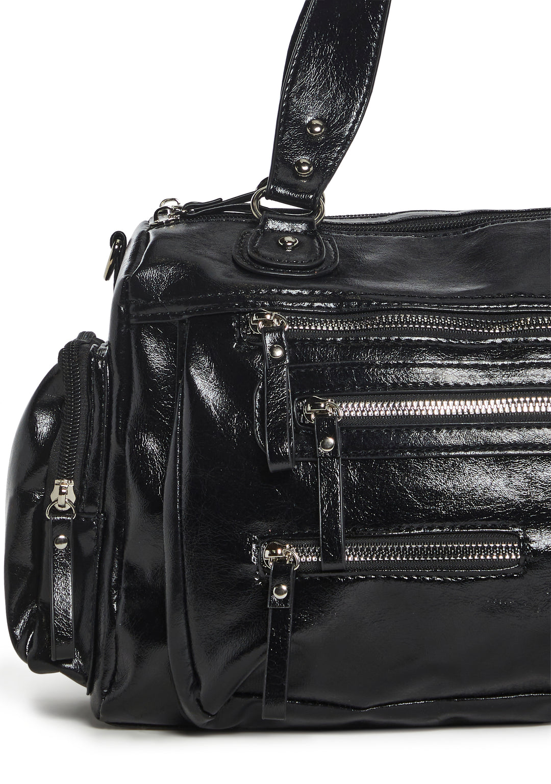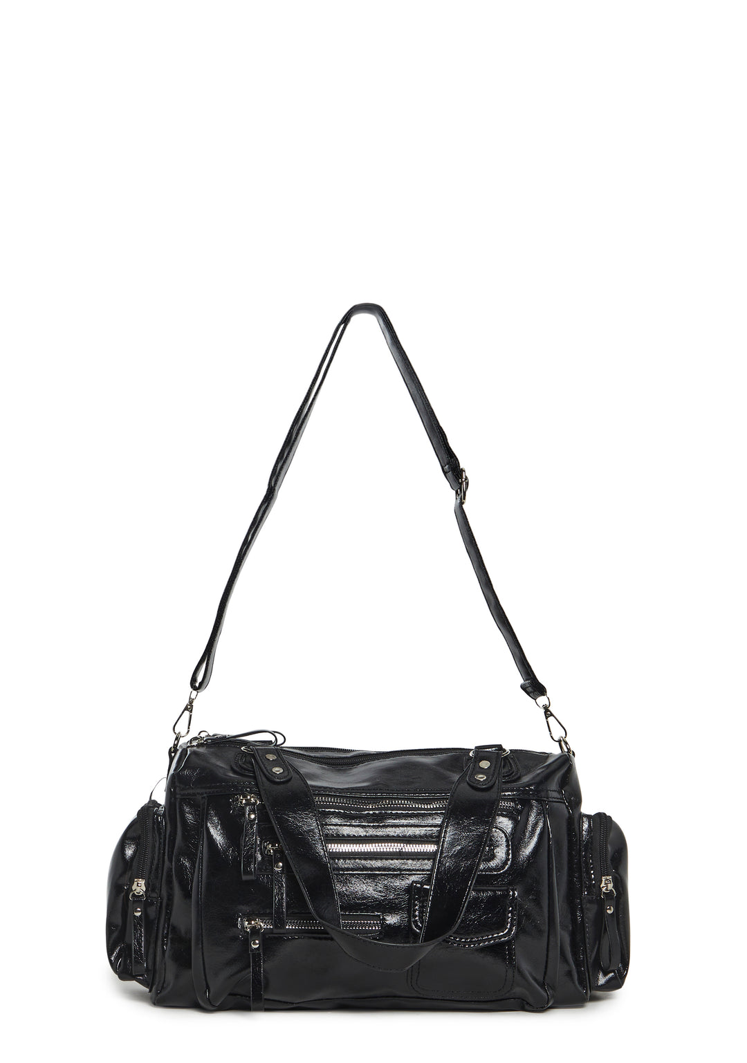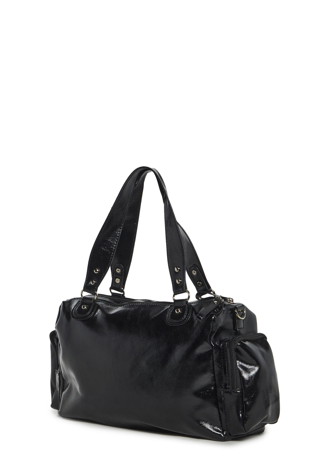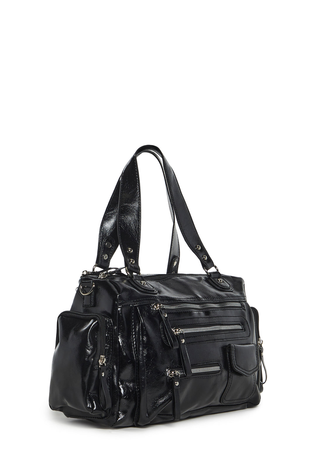 This shoulder bag has a smooth vegan leather construction, top handles, adjustable shoulder straps, side pockets, outward zippered pockets, and a top zipper closure.