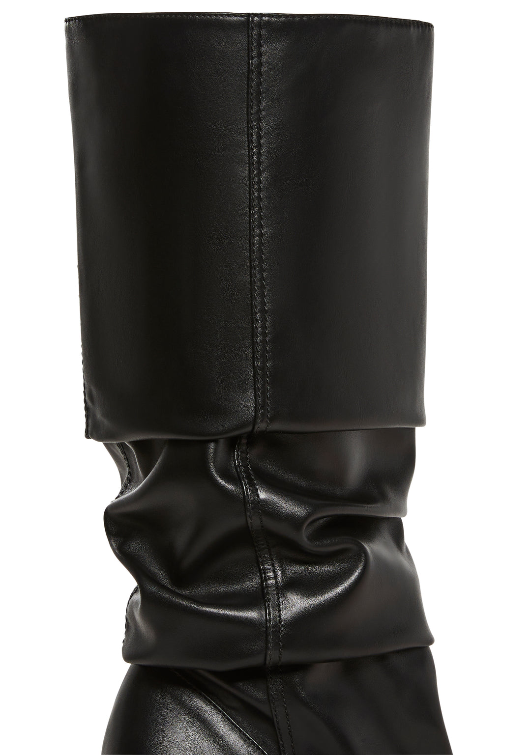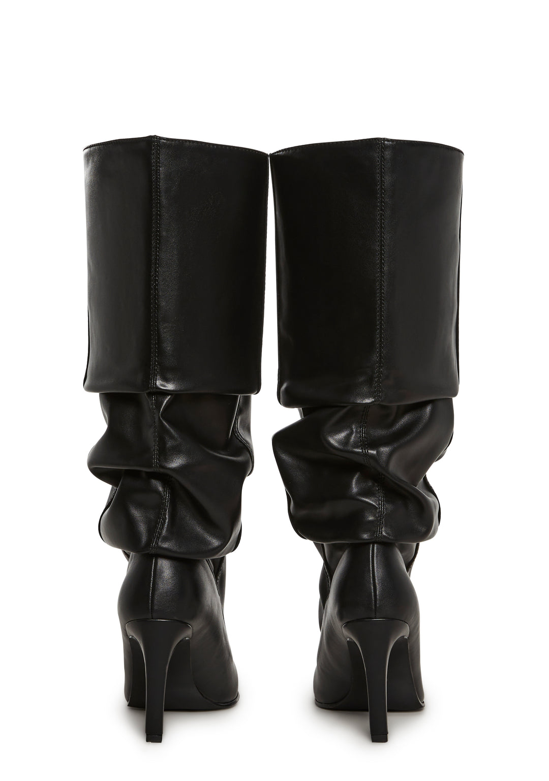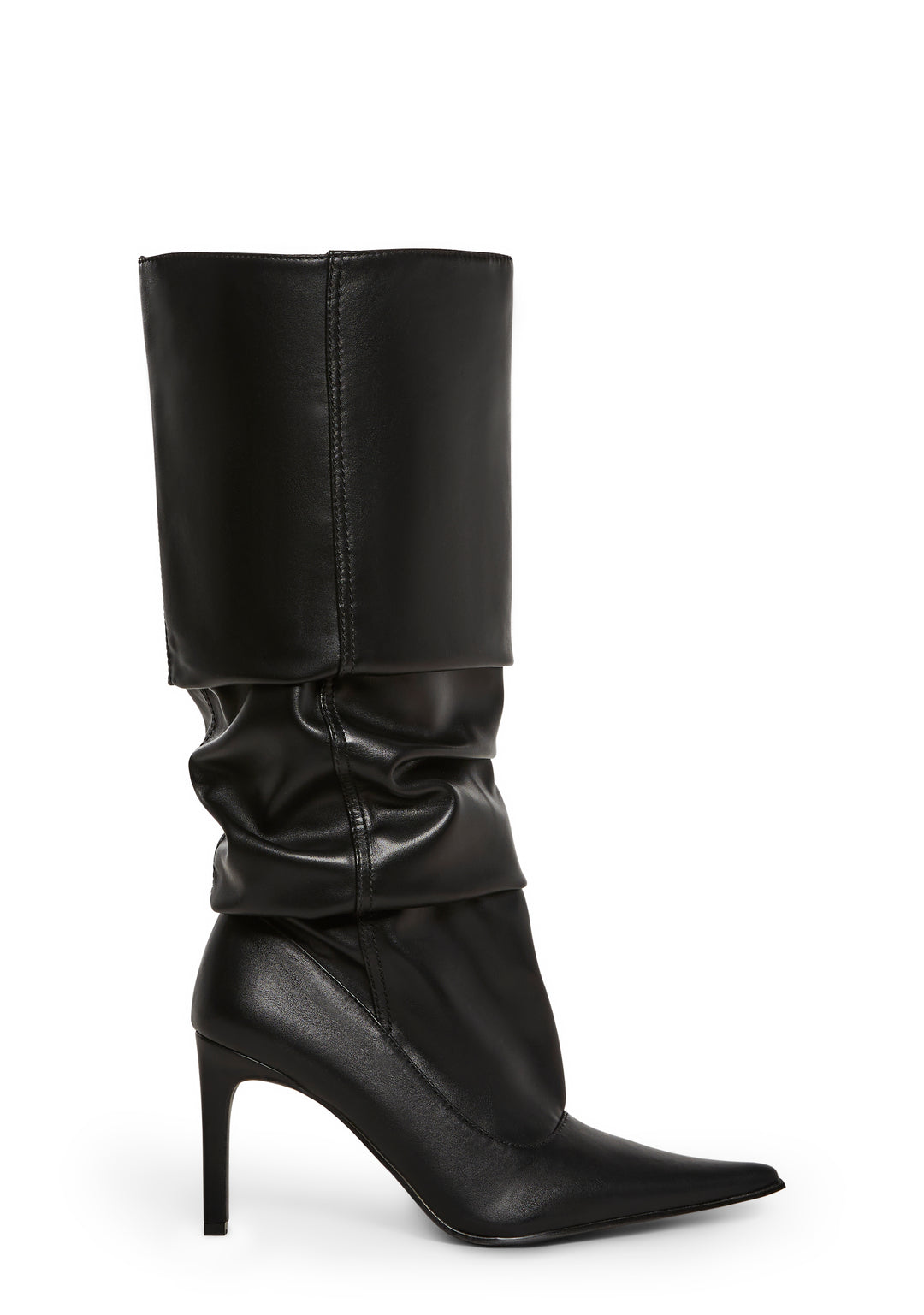 These boots have a smooth vegan leather construction, a slouchy design, a pointed toe design, stiletto heels, and a slip on fit.
