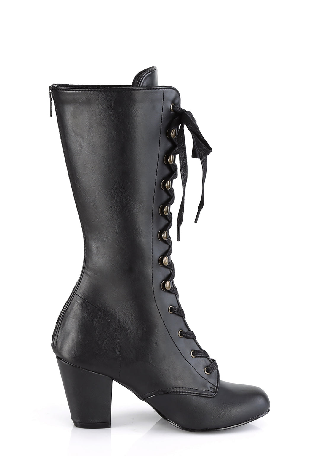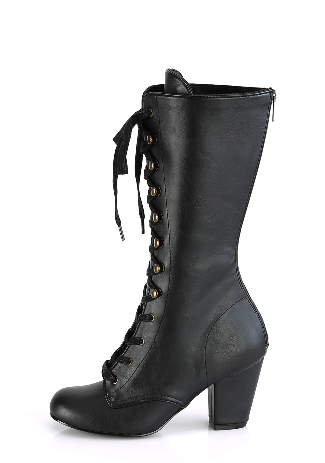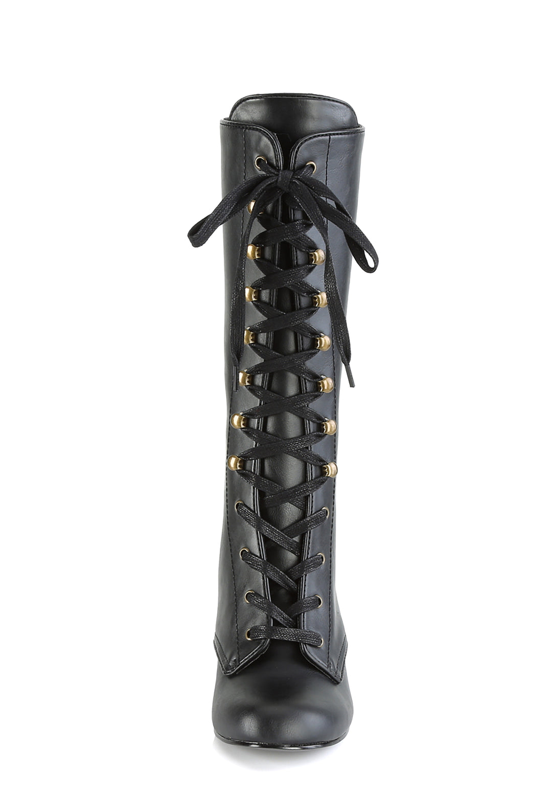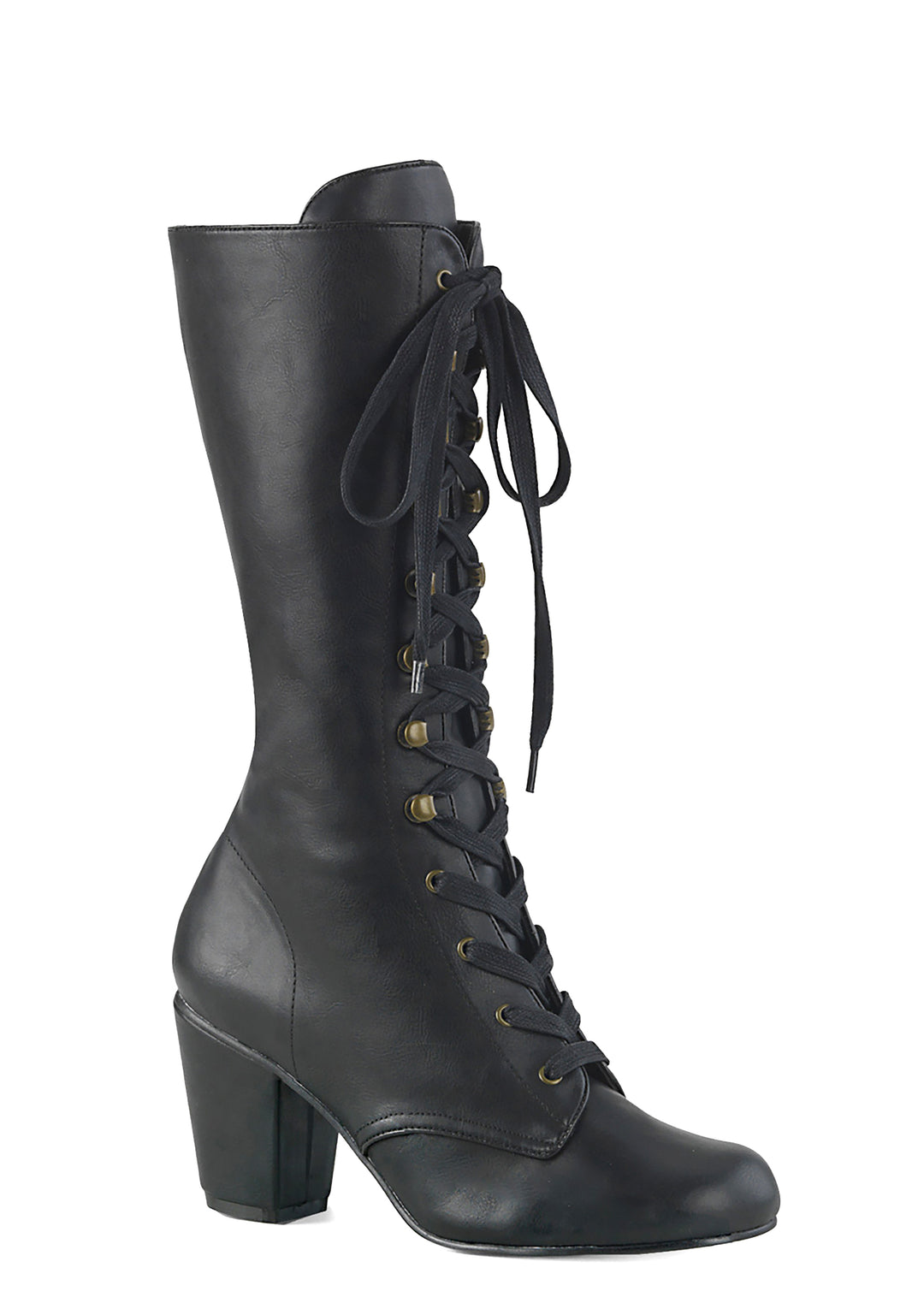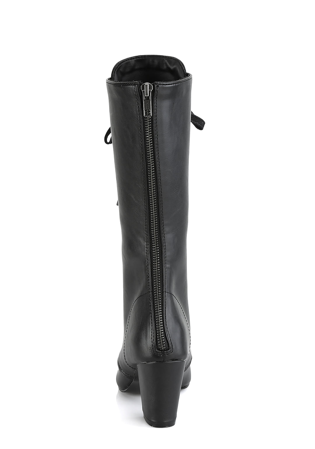 These boots have a vegan leather construction, a round toe design, front lace-ups, and back zipper closures.