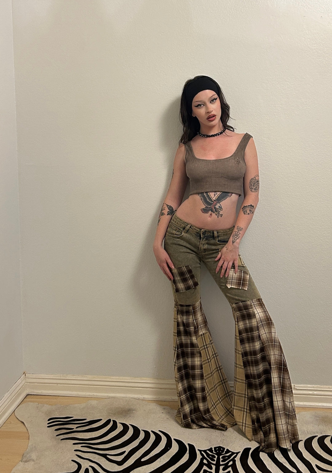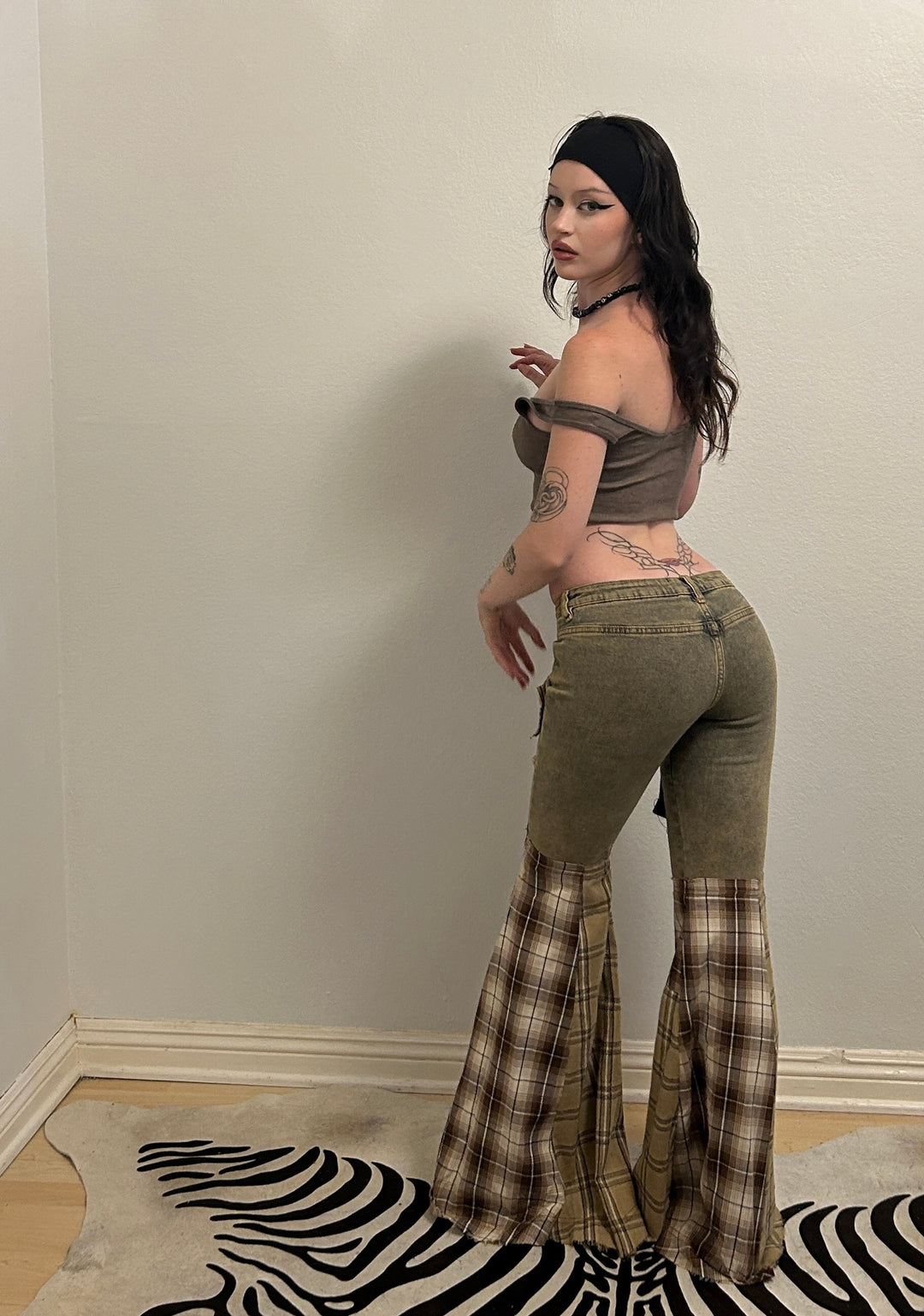 in a washed denim construction with a plaid patchwork design. Flare legs with raw hems, front pockets, and a front button and zipper closure.