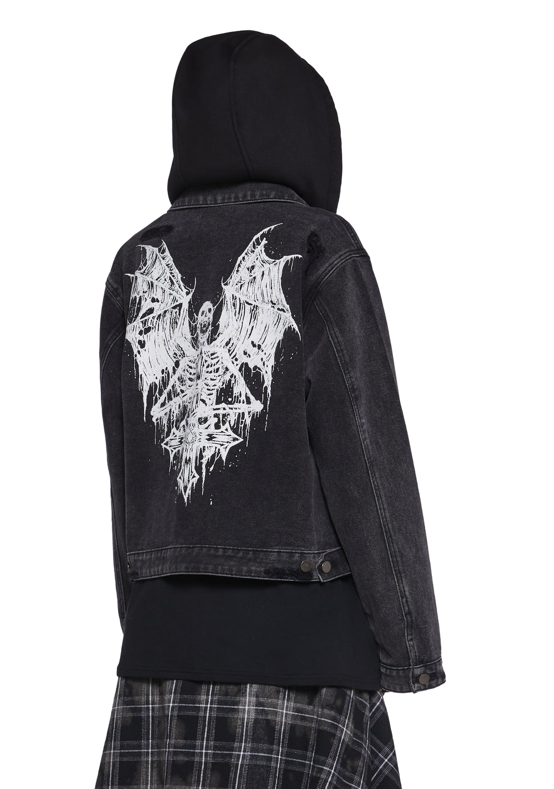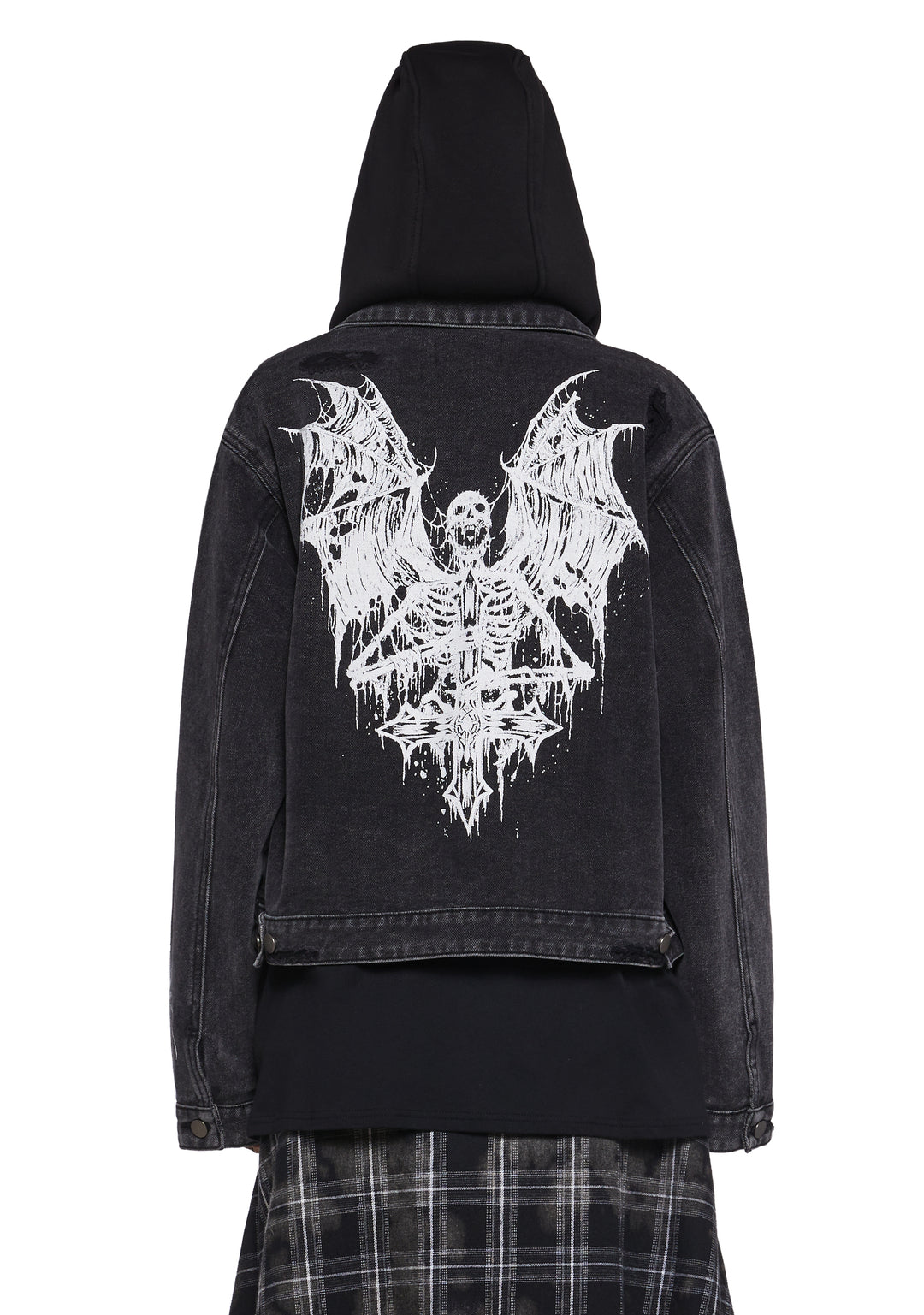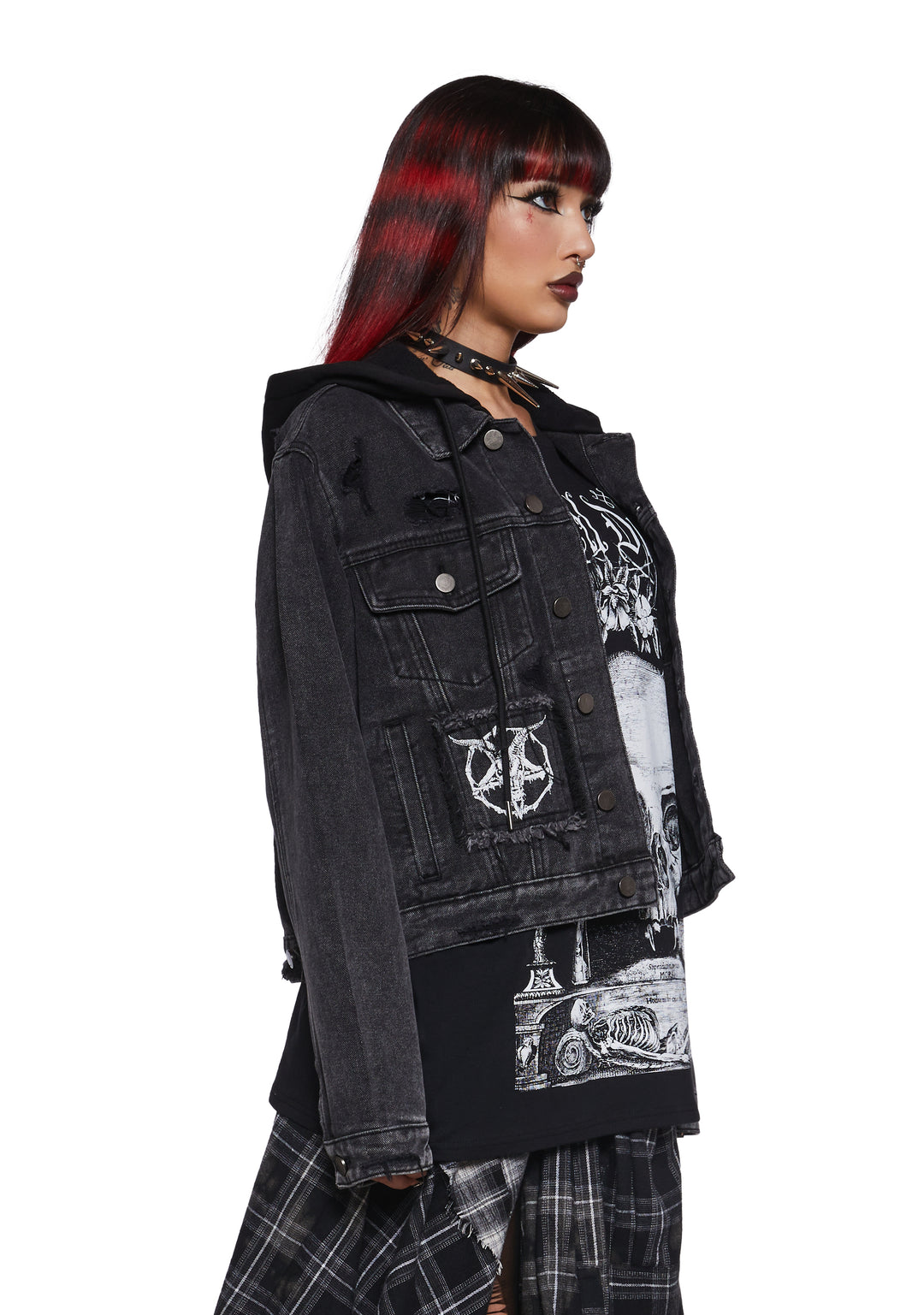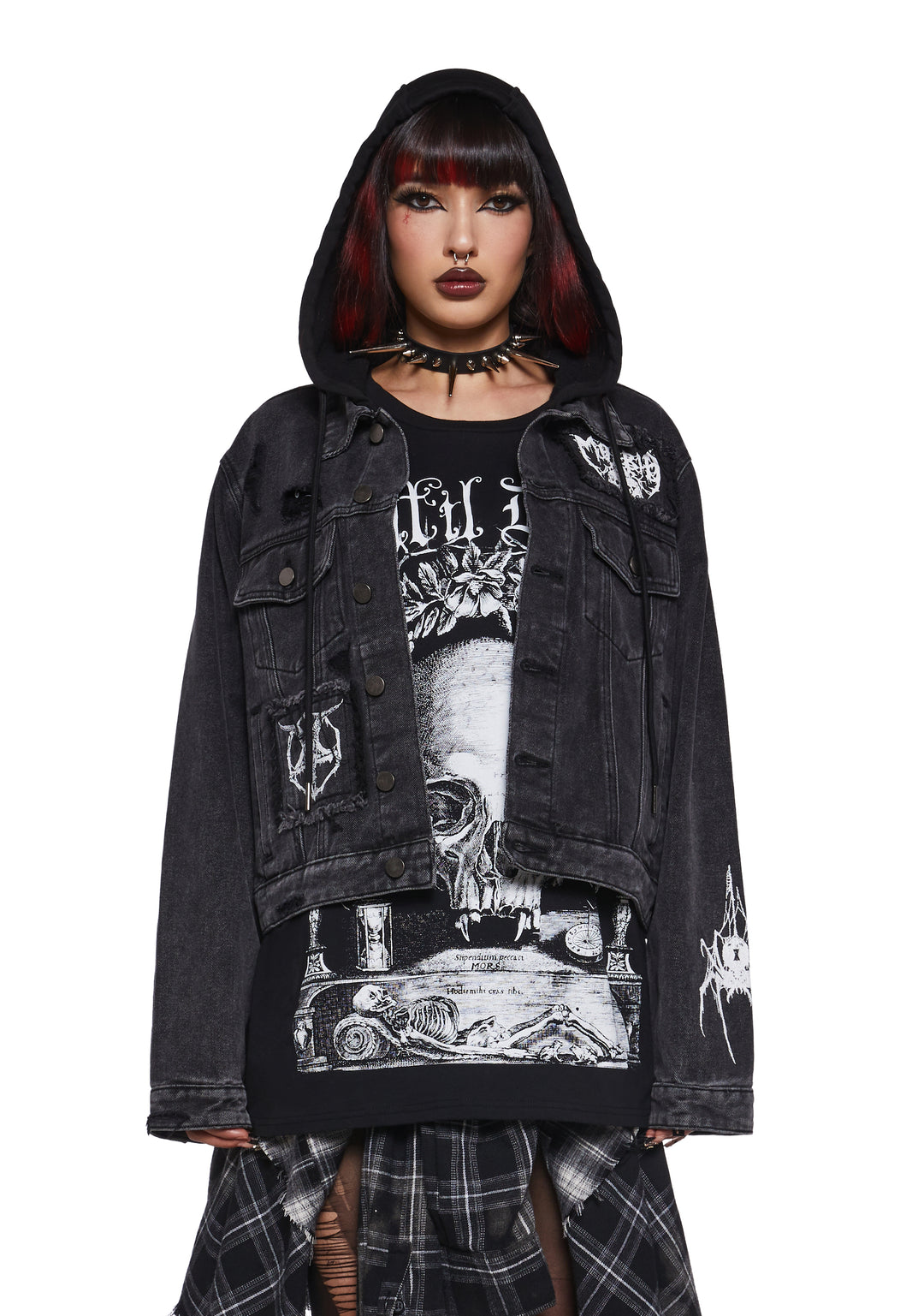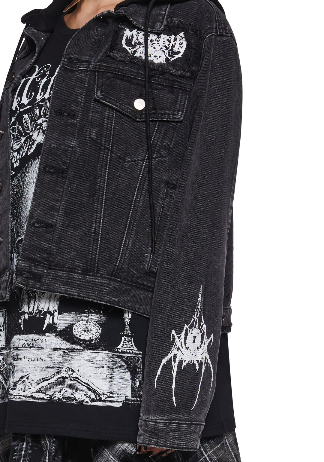 This jacket has a washed denim construction with an attached knit drawstring hood, a distressed design, front pockets with button closures, side pockets, a front patch of Baphomet, a skull patch with the word ‘Morbid,’ a black widow graphic on one sleeve, a back graphic of a skeleton demon with an upside-down cross, and front button closures.