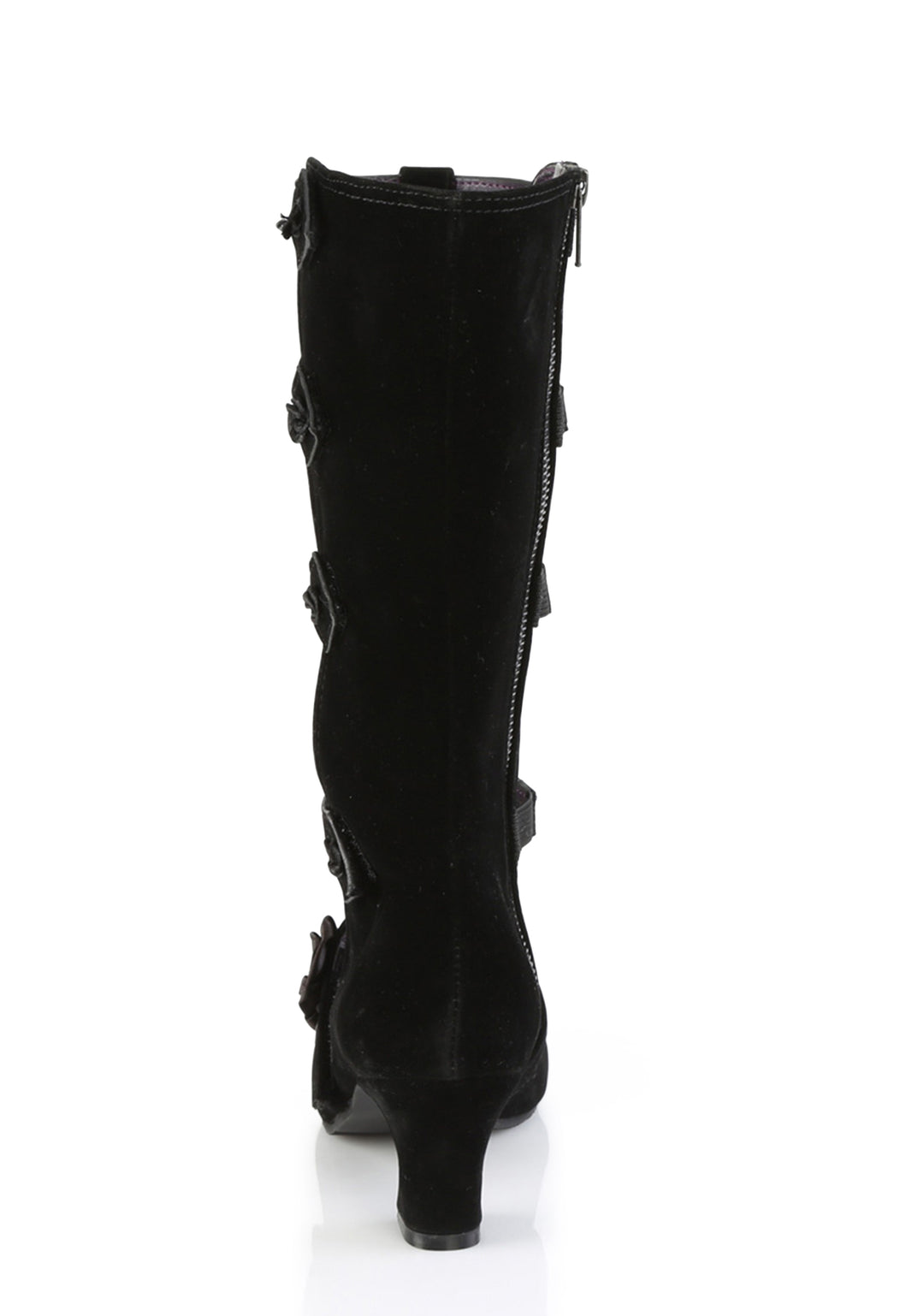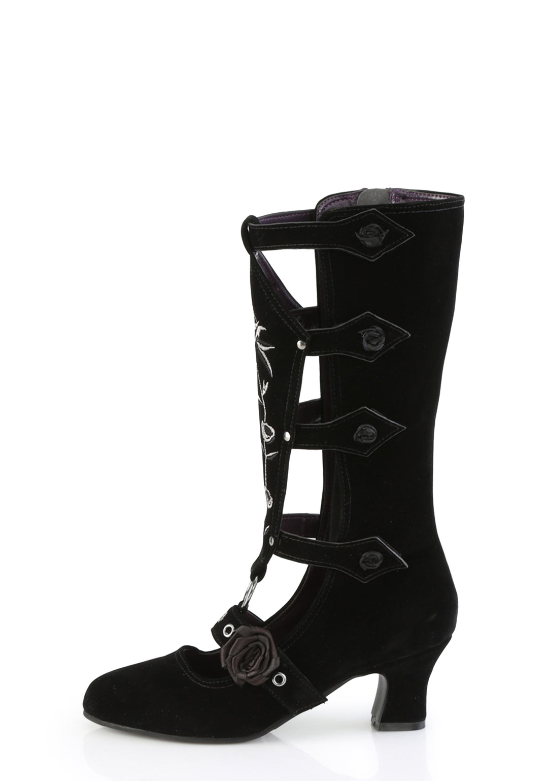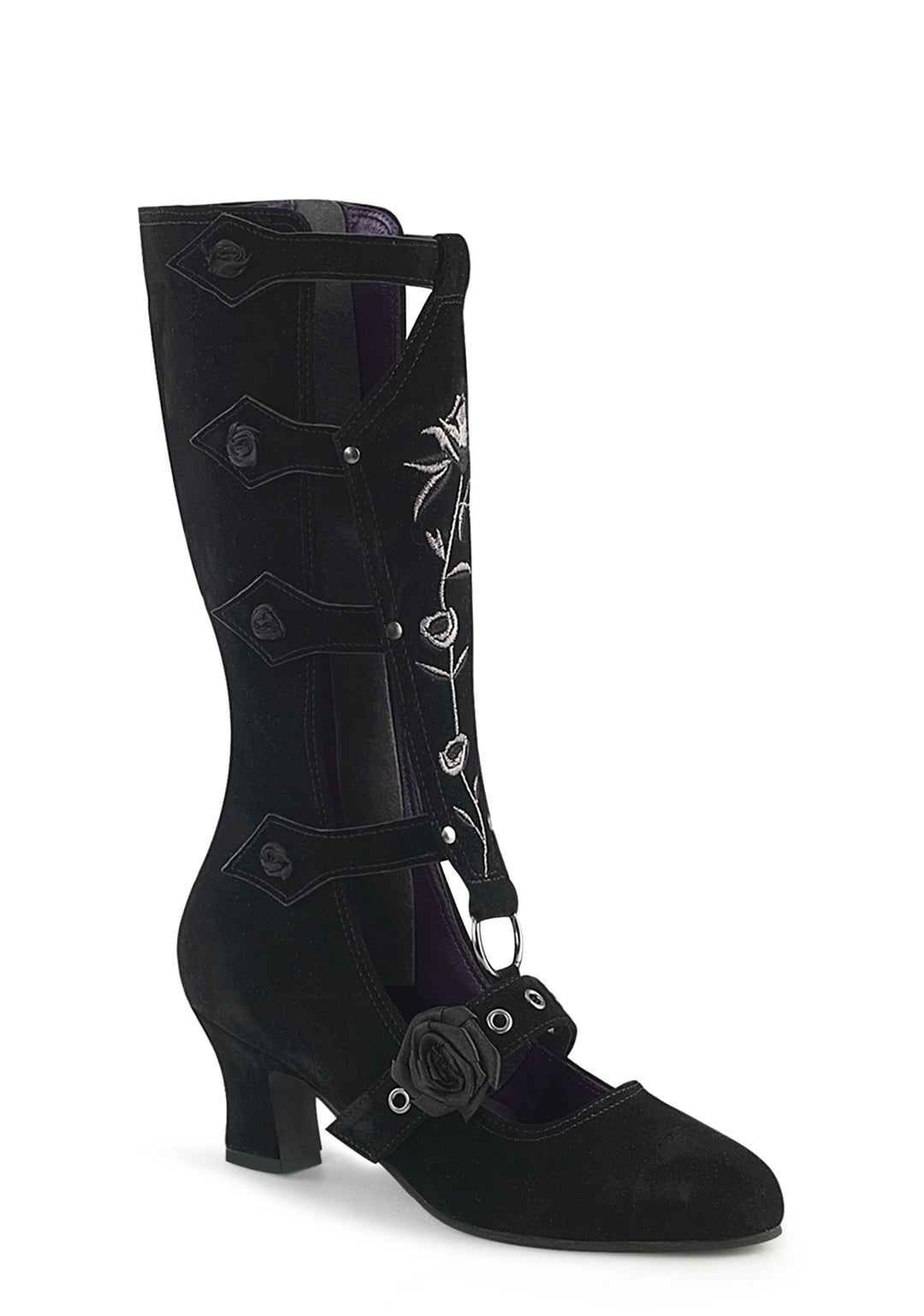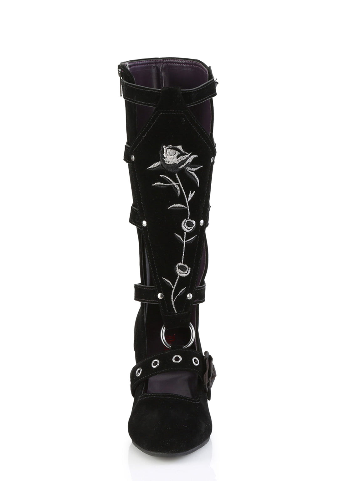 These boots have a faux suede construction, cut outs, embroidered rose details,O-ring hardware,rose shaped buttons, and side zipper closures.