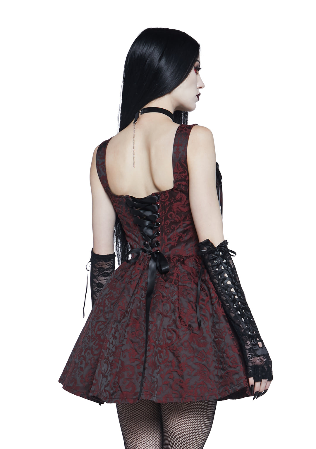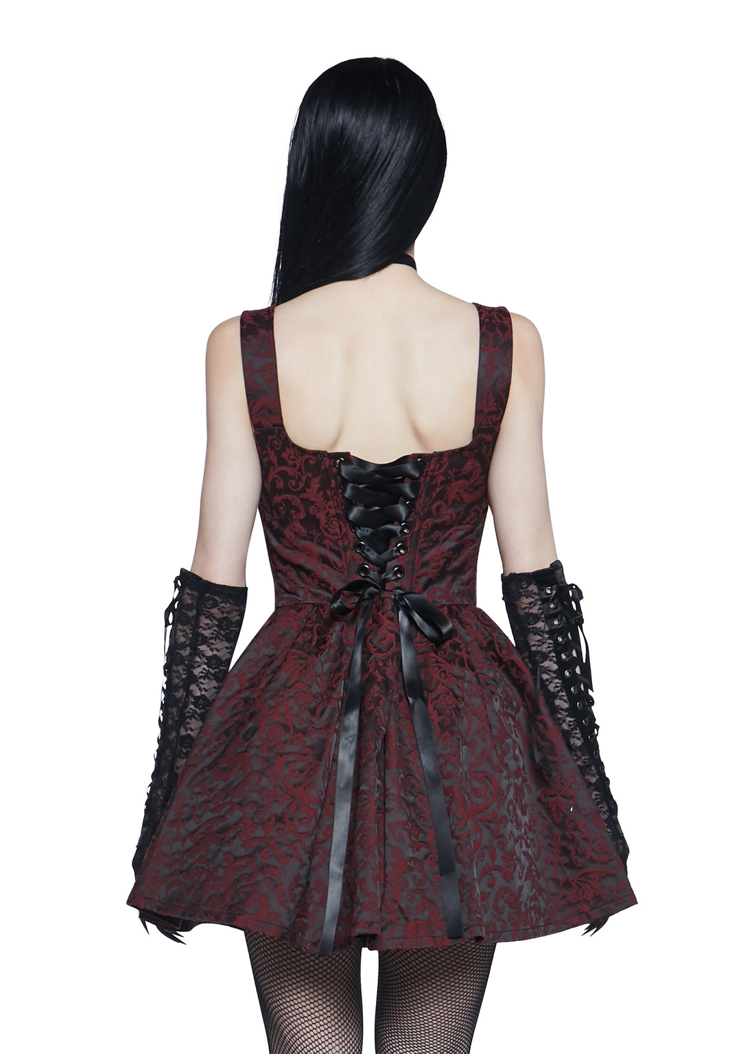 This mini dress has a brocade construction, satin tie shoulders, structured boning, a back lace-up design, and a side zip closure.