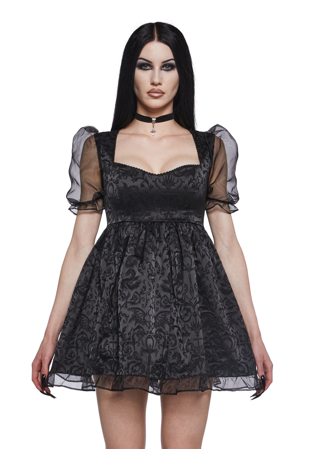 time to carry out your dark master’s wishes?? This spooktacular babydoll dress has an intricate brocade construction, sheer organza puff sleeves, ruffle trim, a sweetheart neckline, and a back satin bow closure.