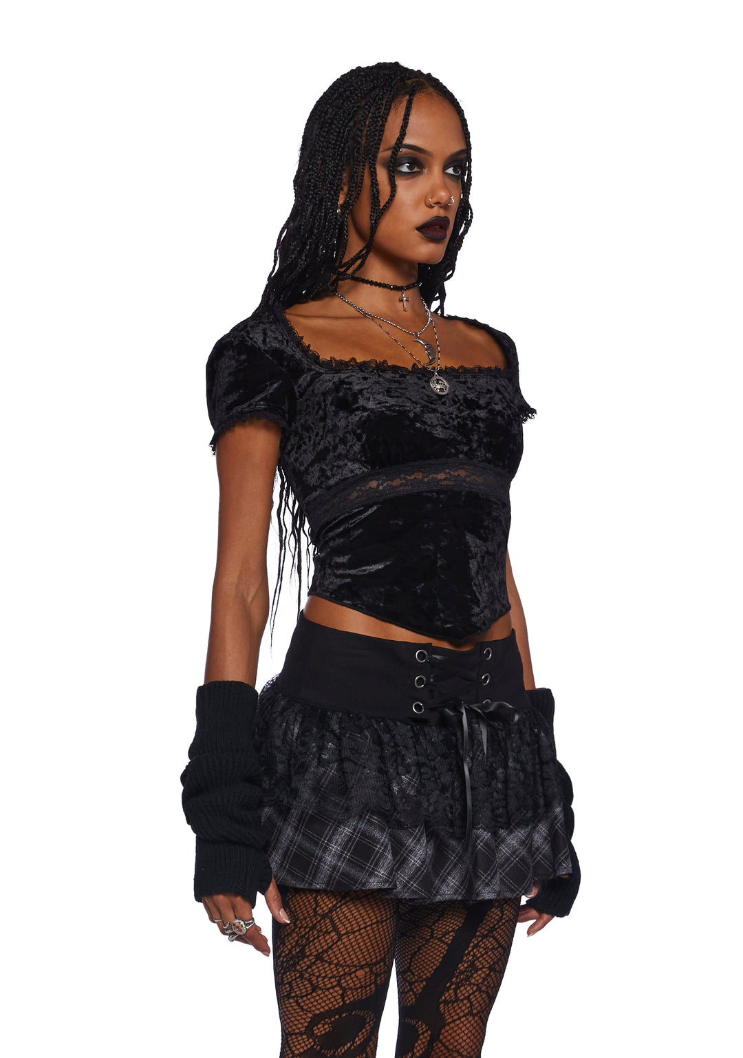 Rule the school with this top that has a stretchy crushed velvet construction, cut out lace detailing, a ruffled lace trim, short sleeves, a pointed hem, and a cropped fit.