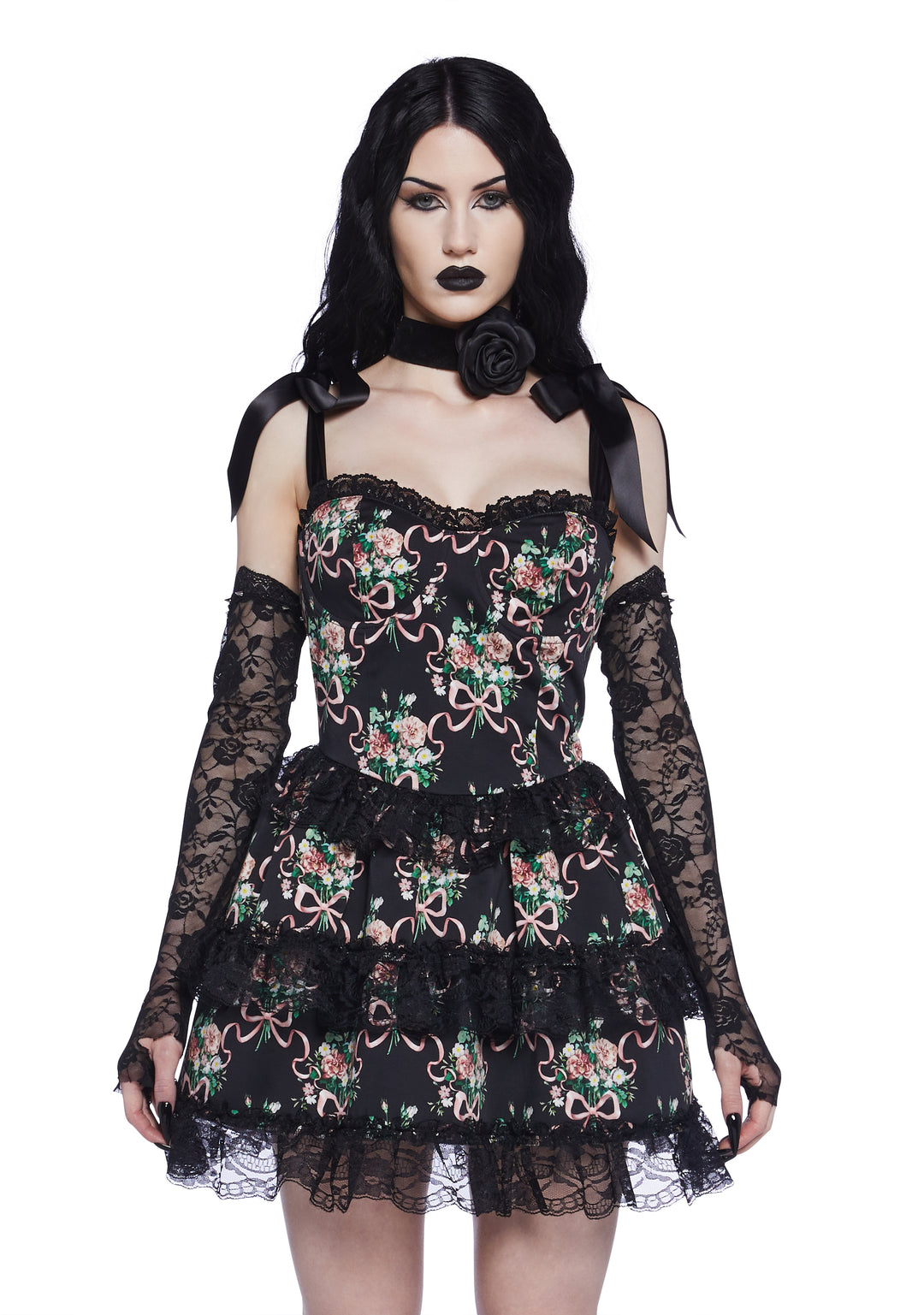 cuz you exude a dark enchantment. This mini dress has a twill construction with a floral bow print throughout, a wired underbust, a tiered ruffled lace design, lace detailing, a taffeta mesh petticoat, satin self-tie shoulder ties, and a back zipper closure.
