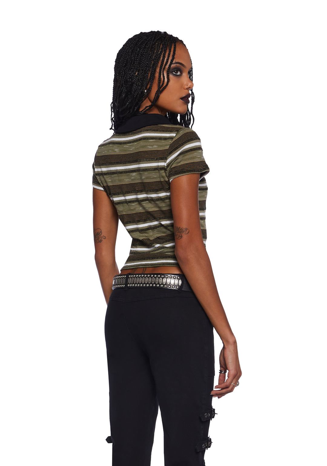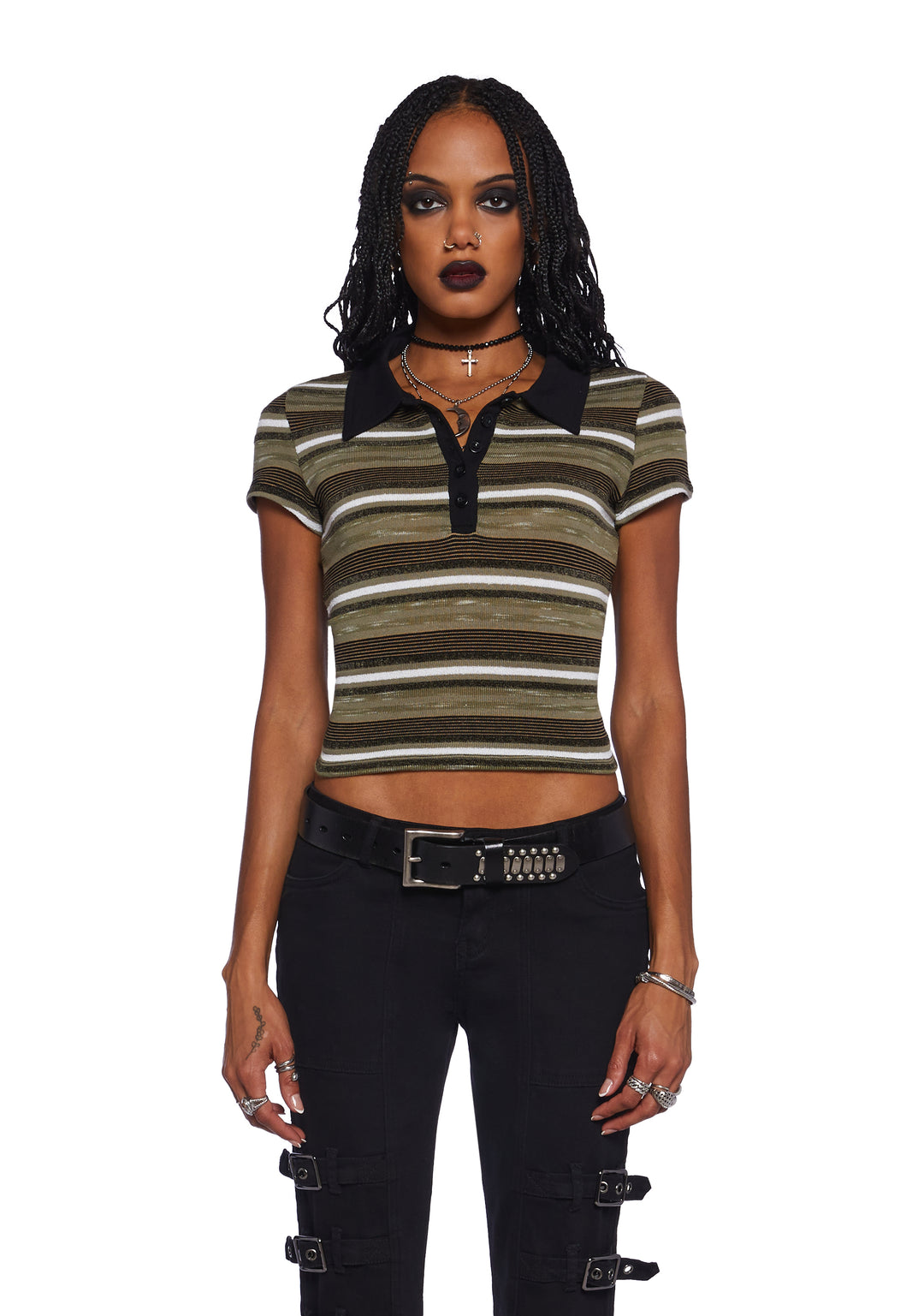 This polo-inspired top has a stretchy, ribbed knit construction with a striped design, a cropped fit, a contrast collar, and front button closures.