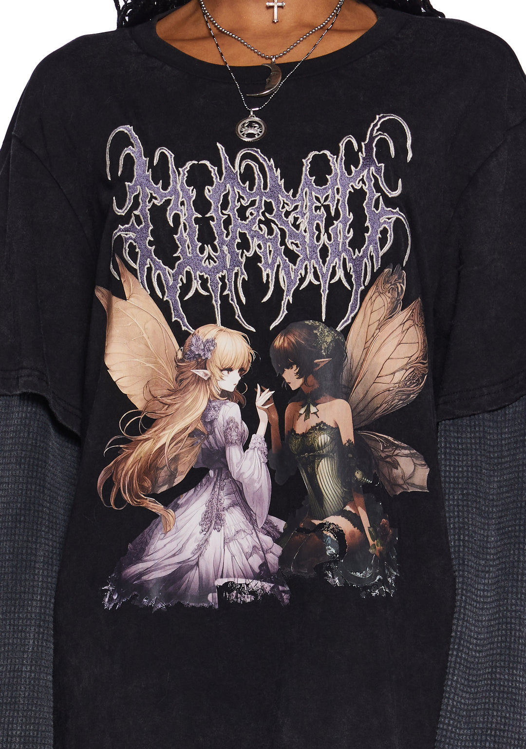 This long-sleeve tee has a washed knit construction with attached waffle knit long sleeves, embroidered Gothic lettering, a front graphic print of two fairies, and an oversized fit.