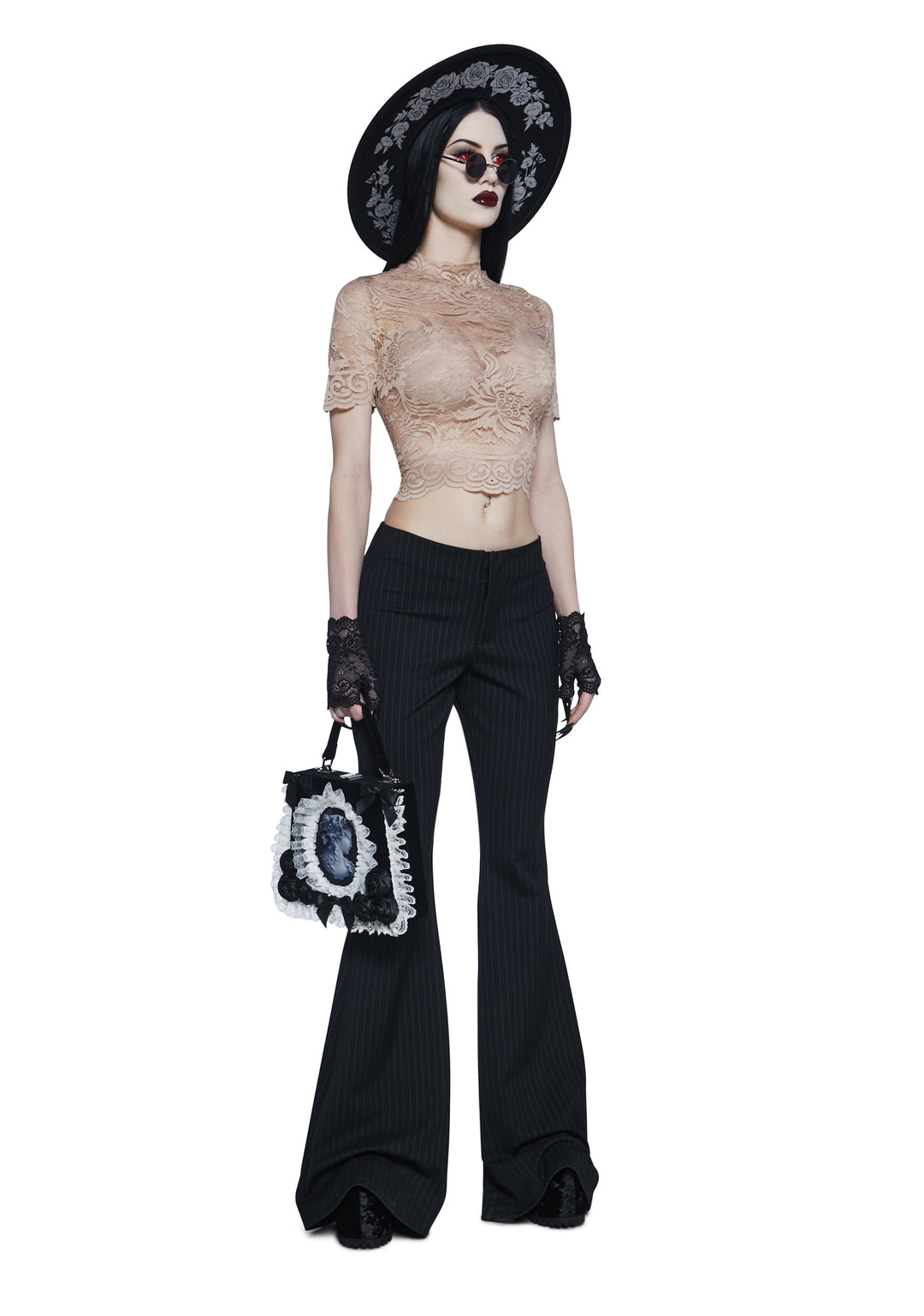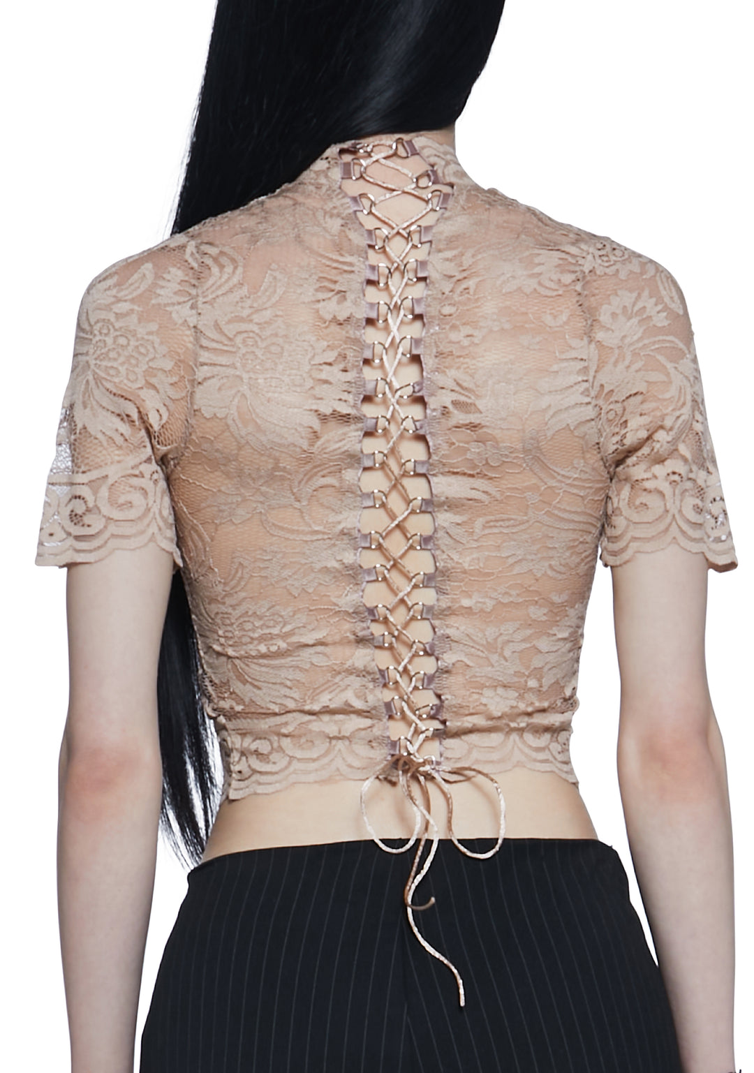 Control their every move in this sexy lace crop top that has a mock neck, short sleeves and a lace-up closure on the back.