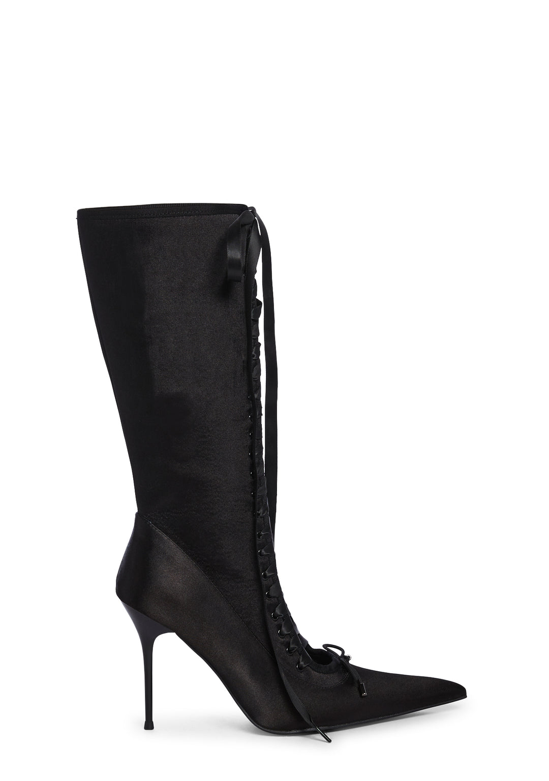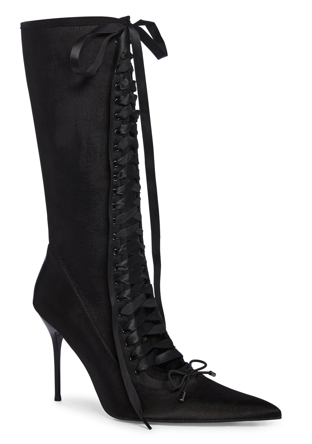 cuz your lips are sealed. These boots have a pointed toe design, a satin construction, stiletto heels, bows on the uppers, a front lace-up design, and side zipper closures.