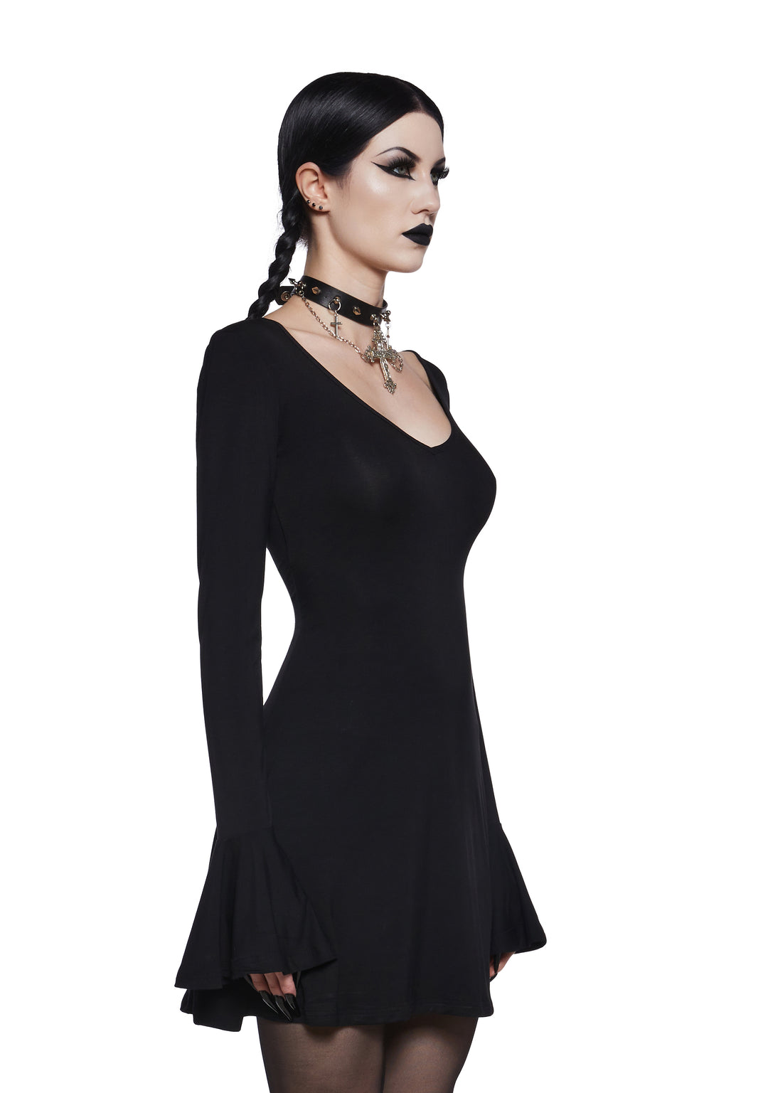 you’re on your worst behavior. Be bad in this mini dress with an a-line fit, a v neckline, long sleeves with bell cuffs, and an open back with strappy details in a pentagram.