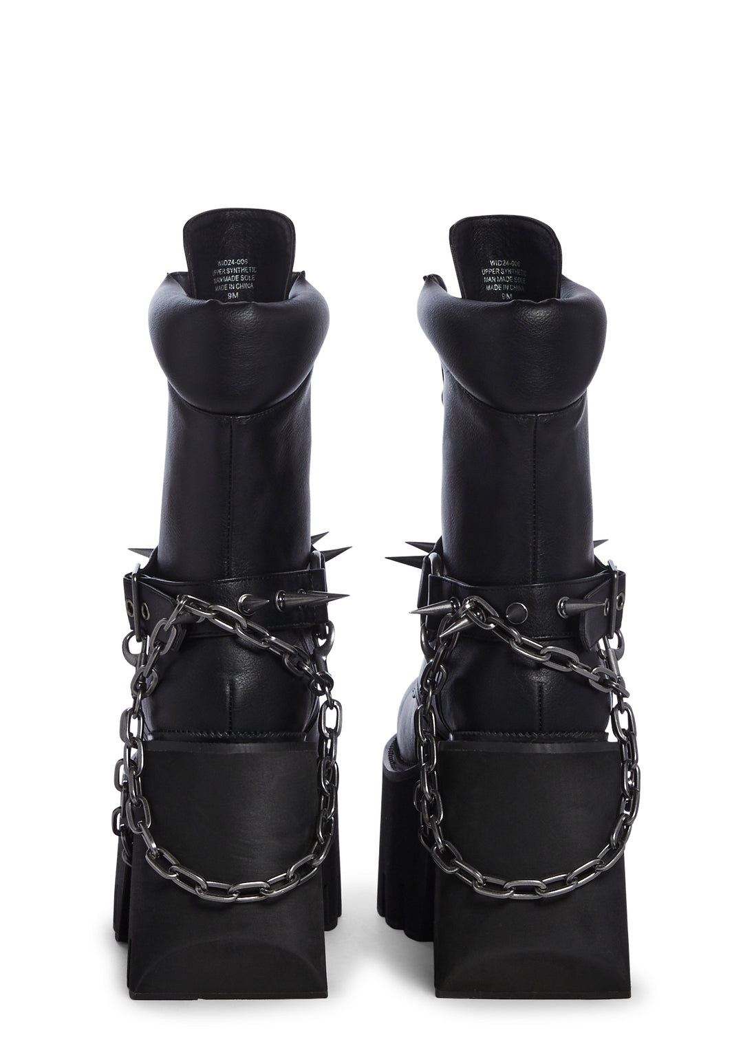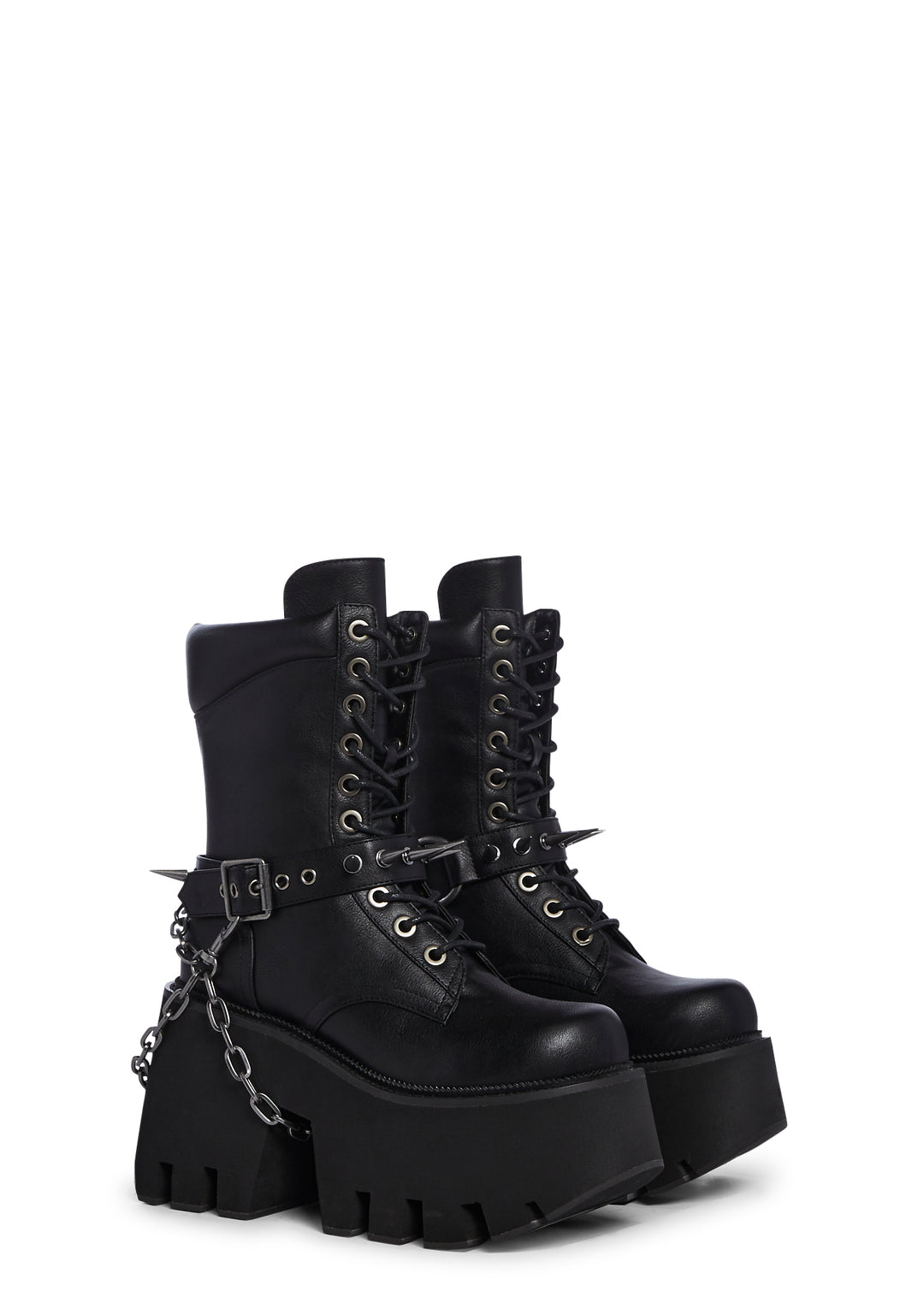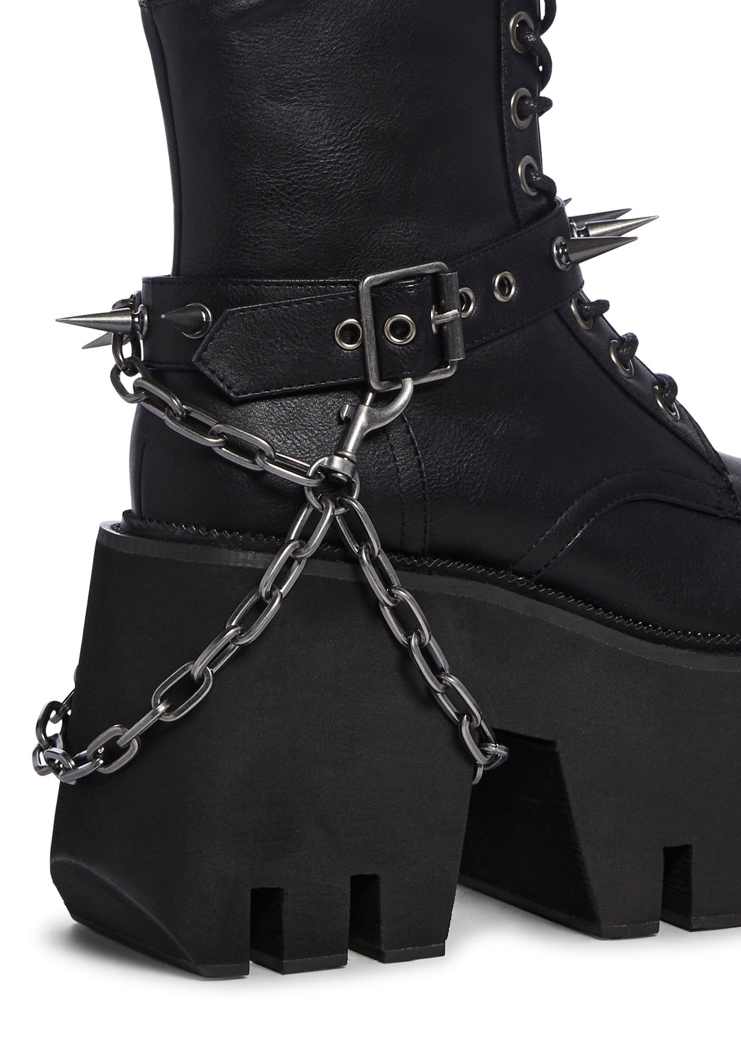 only the strong survive. These combat boots have a vegan leather construction, front lace up closure, removable o-ring belts, spiked detailing, removable chainlink, and cushioned upper.