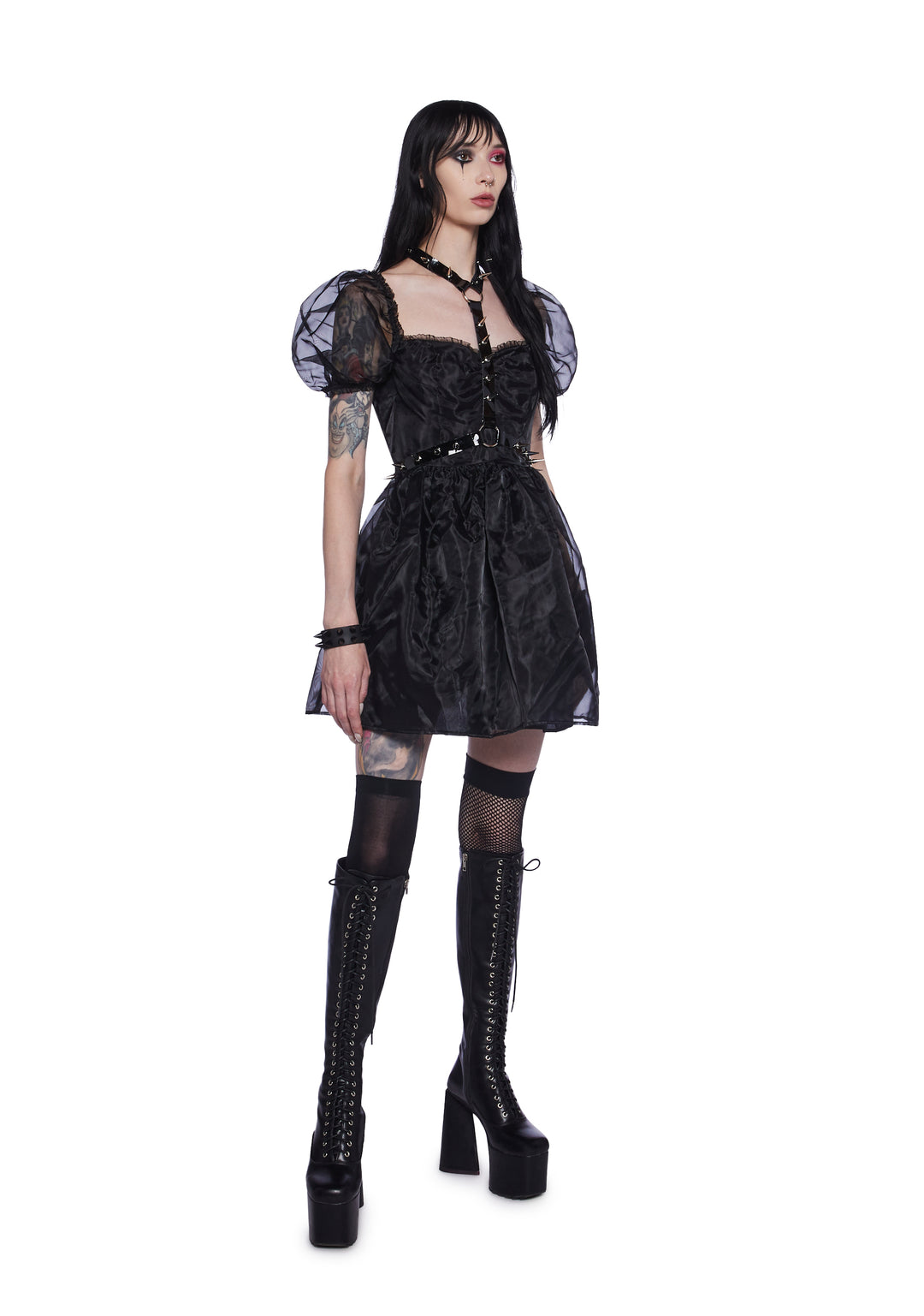 because you give hell a whole new meaning. This unholy babydoll mini dress features a sheer organza overlay, short puff sleeves, and a patent body harness with spiked accents.