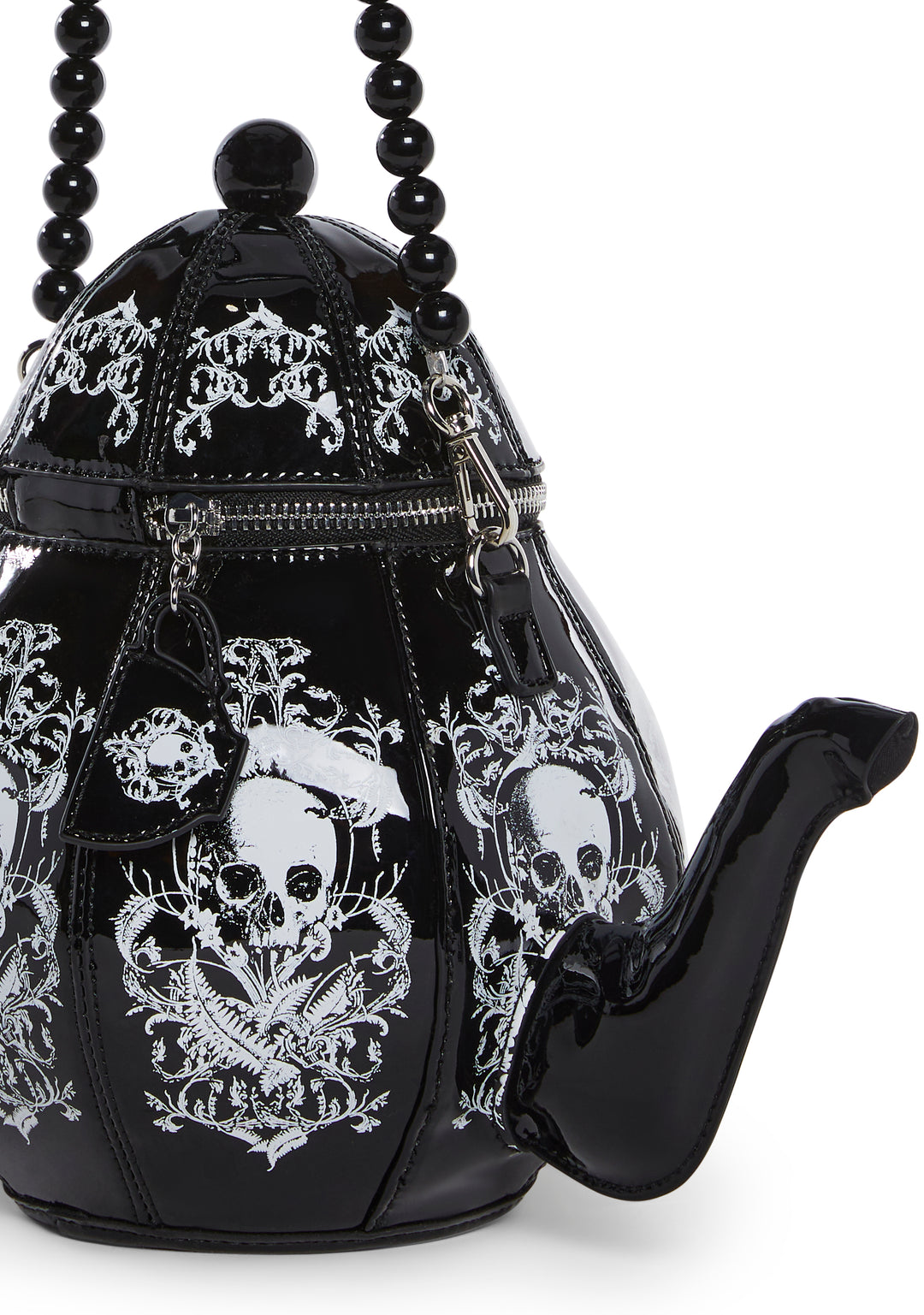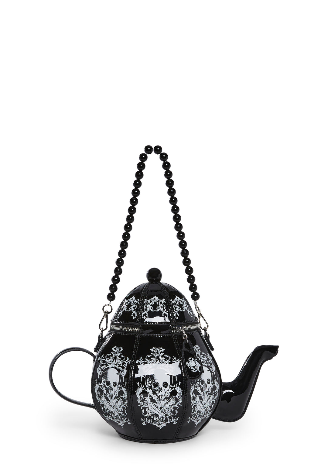 cuz it’s time for sinister splendor. This bag has a vegan leather construction, all over skull print, a detachable pearl shoulder strap, a top zipper closure, and comes with a mini teacup charm.