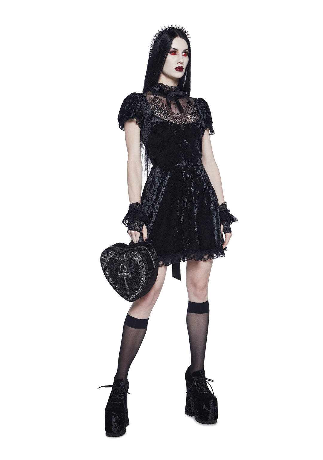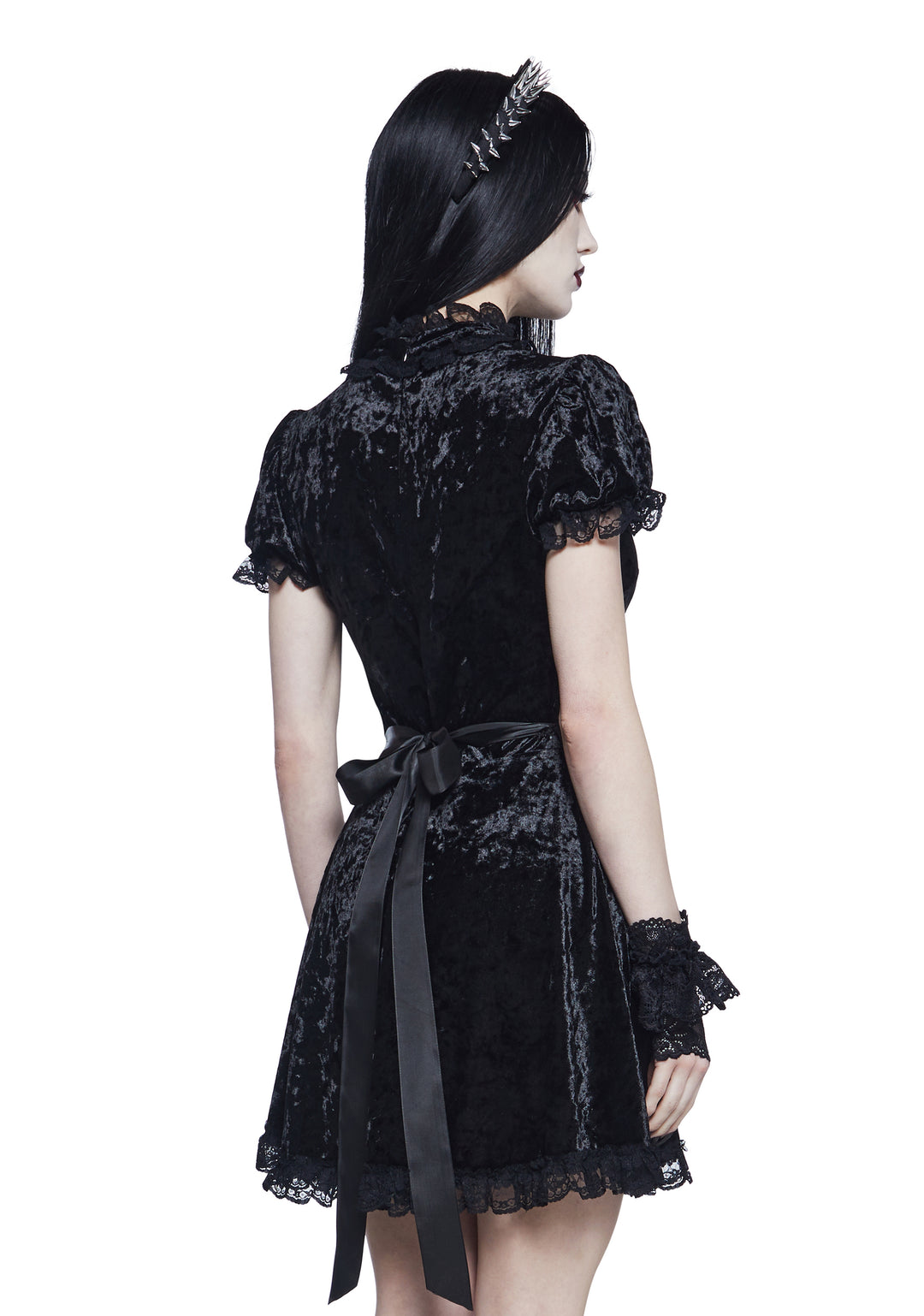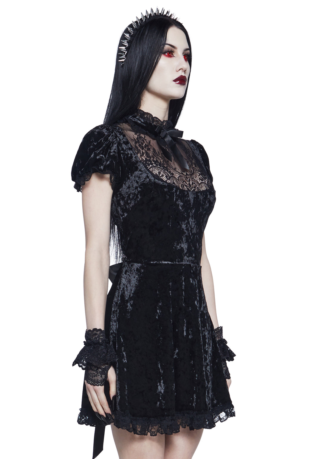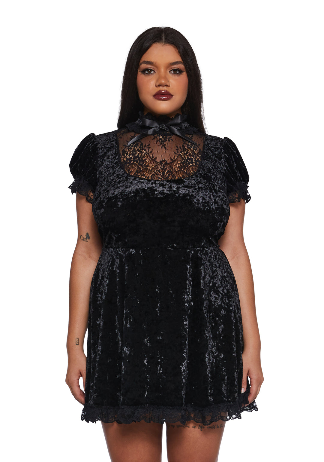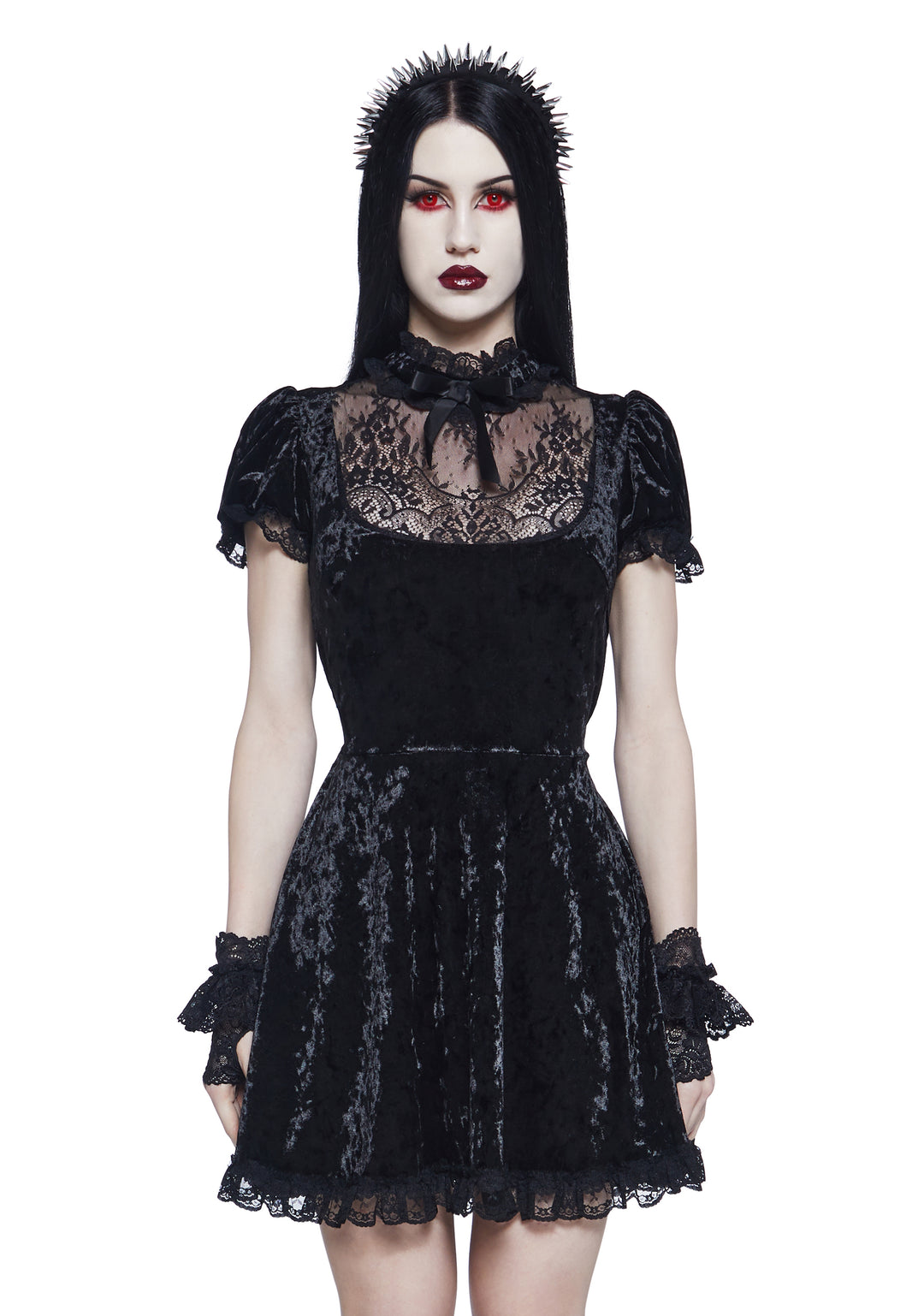 This mini dress has a velvet construction with ruffled lace trim, a sheer floral lace bust with a high ruffled collar, a front bow applique, short puff sleeves with elastic cuffs, a self-tie ribbon waist closure, and a back zipper closure.