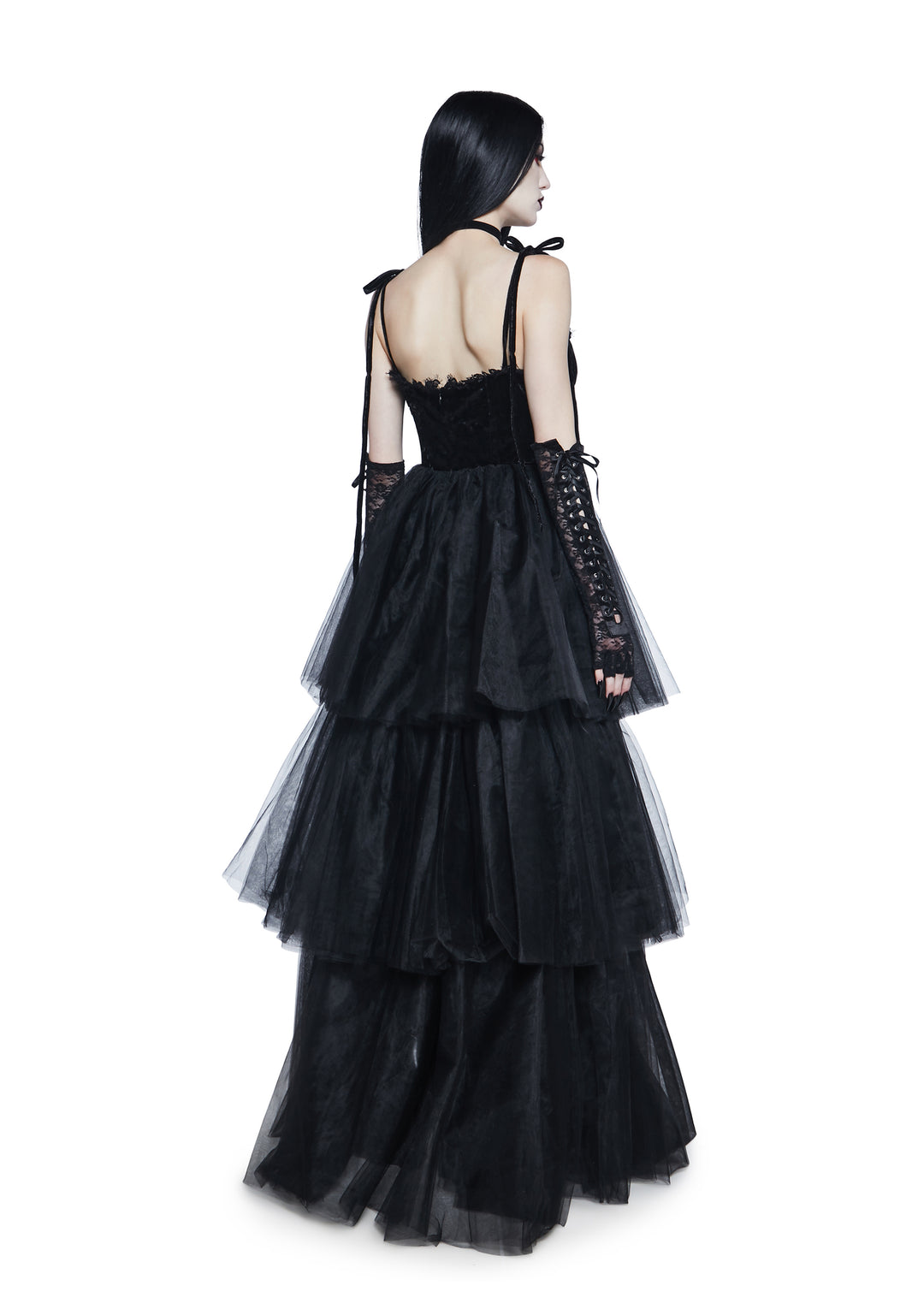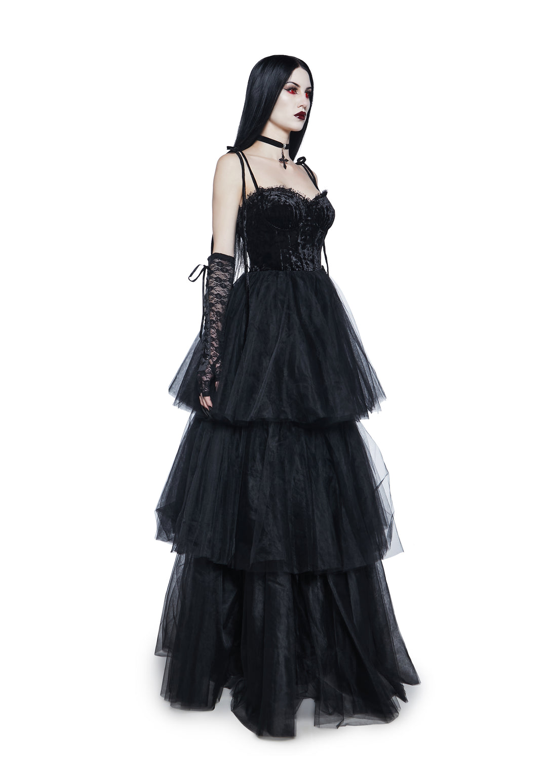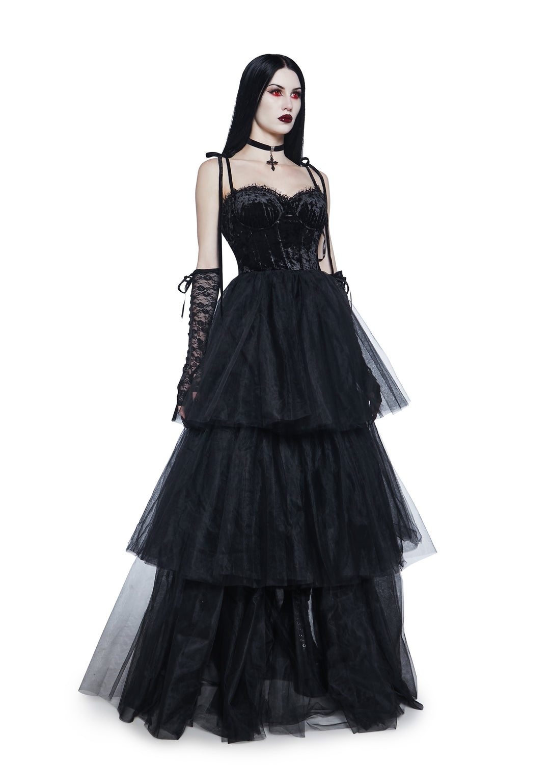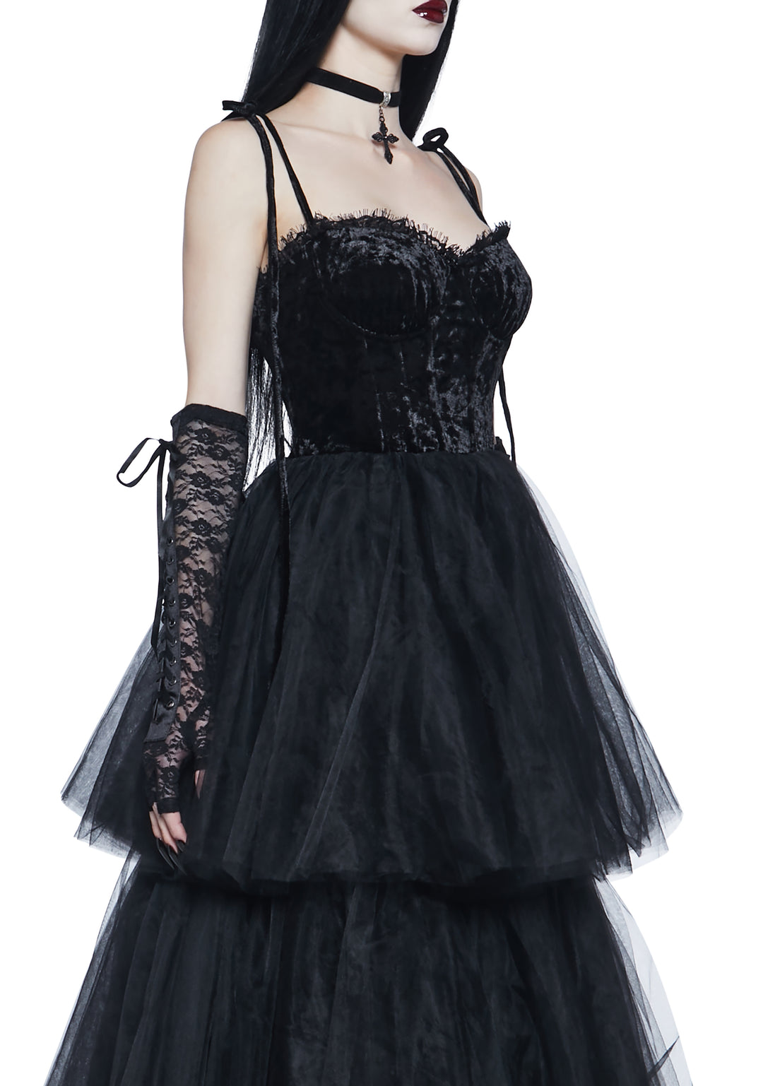 What is lurking in the dark? Could it be you in this ball gown that features a corset top that has a velvet construction, structured boning, an underwire bust, shoulder ties, an eyelash trim along the bustline, an attached tulle skirt with a tiered design, and a back zip closure.