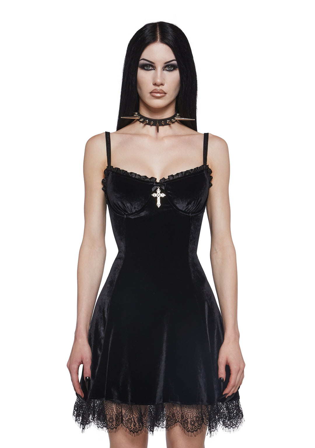 will have them under the illusion of devotion. You’re like a prayer in this impure velvet mini dress that has sinful lace trim, underwire support, a deathly devoted cross design and back zip closure.