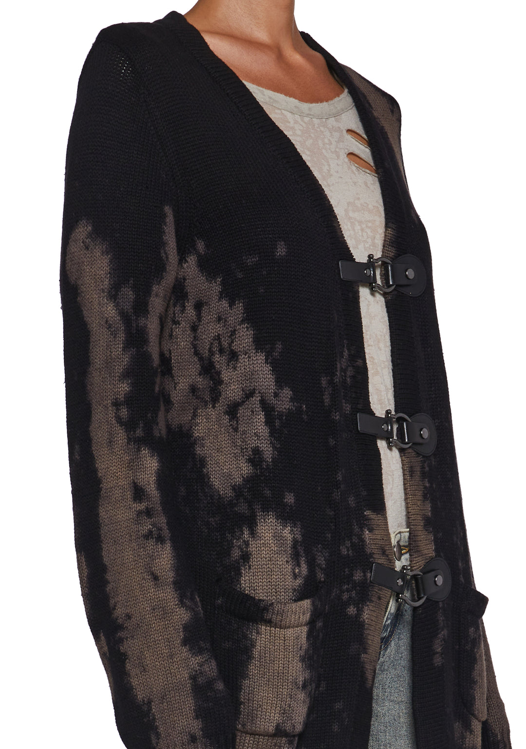 This cardigan has a knit construction, a bleached finish, a distressed design, front pockets, an oversized fit, and vegan leather metal loop snap button closures.