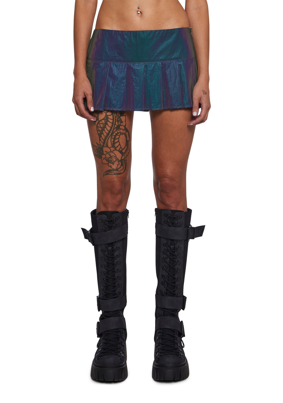 This mini skirt has a rainbow reflective material, a pleated design, and a side zipper closure.