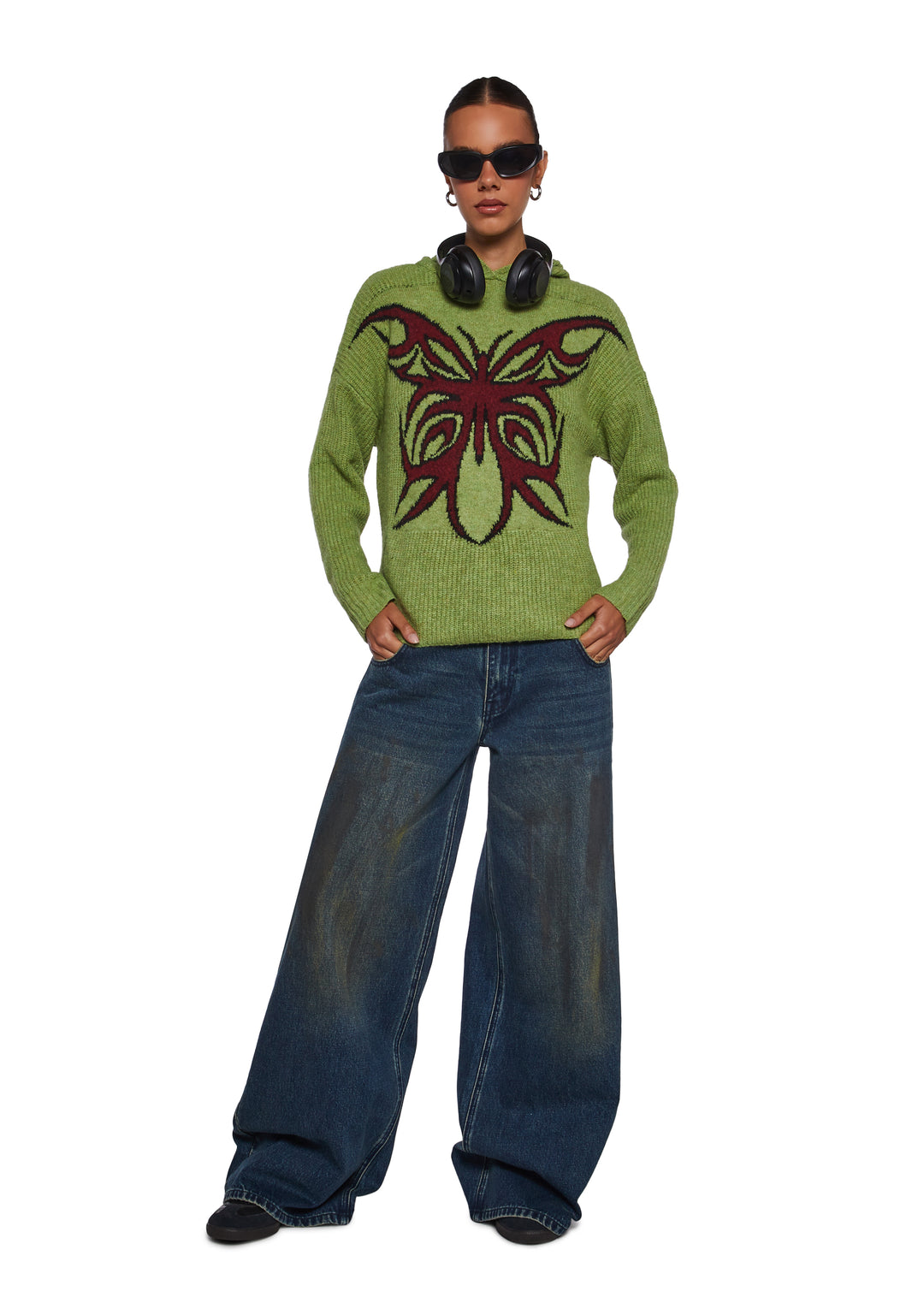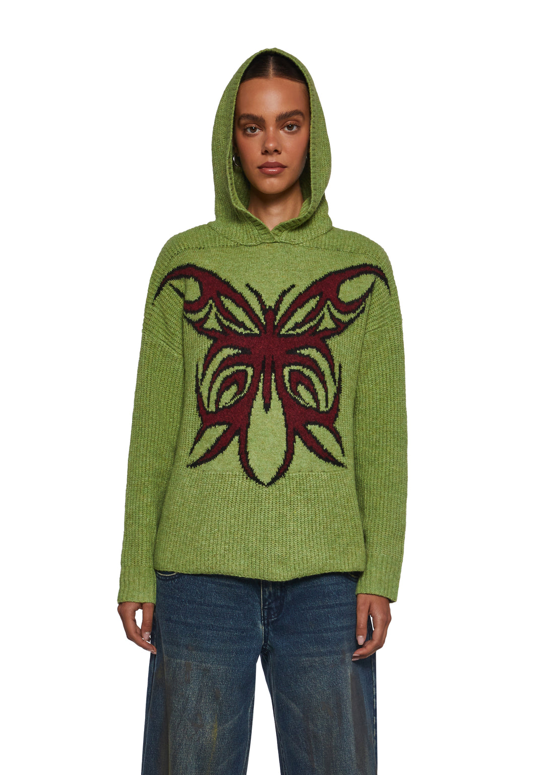 This hoodie has a stretchy soft chunky knit construction, an intarsia butterfly graphic on the front, and an oversized fit.