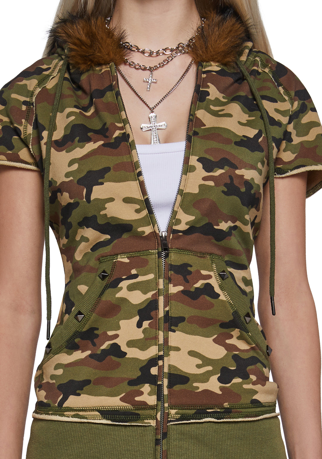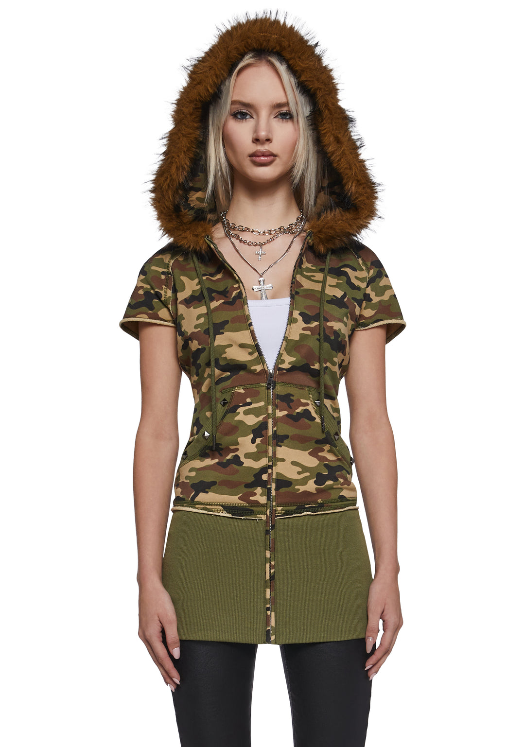 Stand out in the Texting U Camo Hoodie Mini Dress, a bold blend of streetwear and comfort. Featuring a camo-printed bodice, short sleeves, and an attached faux fur hoodie with adjustable ties, this dress adds attitude. Kangaroo pockets and a front zipper closure bring function, while the green ribbed skirt completes the look.