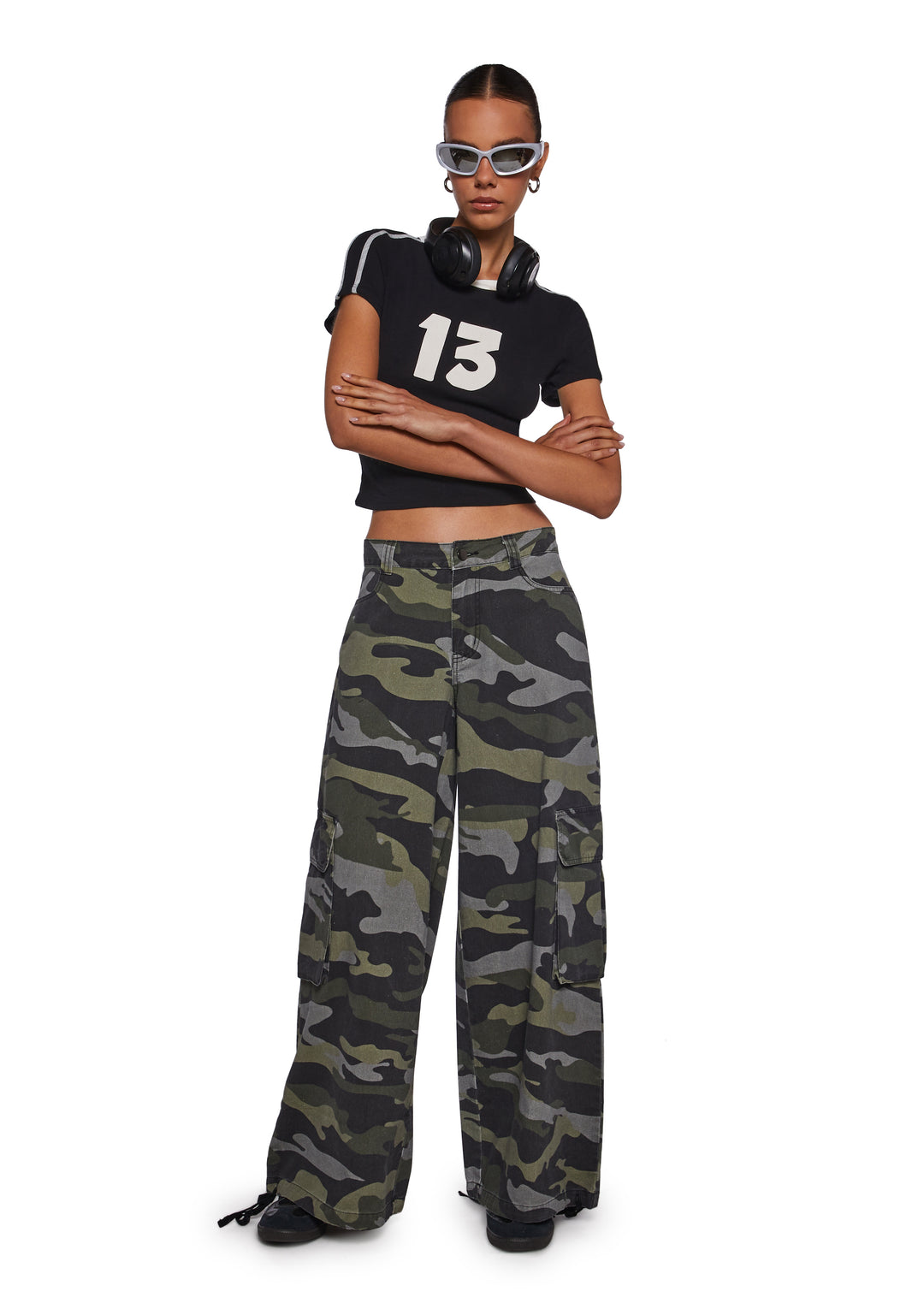 These pants have an all over camo pattern, a cotton construction, a wide leg silhouette, cargo pockets on the front, front and back pockets, and a front button and zipper closure.