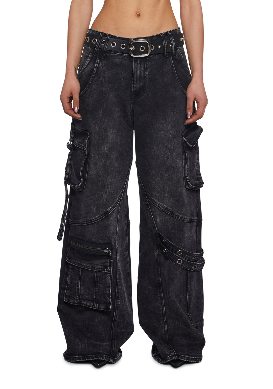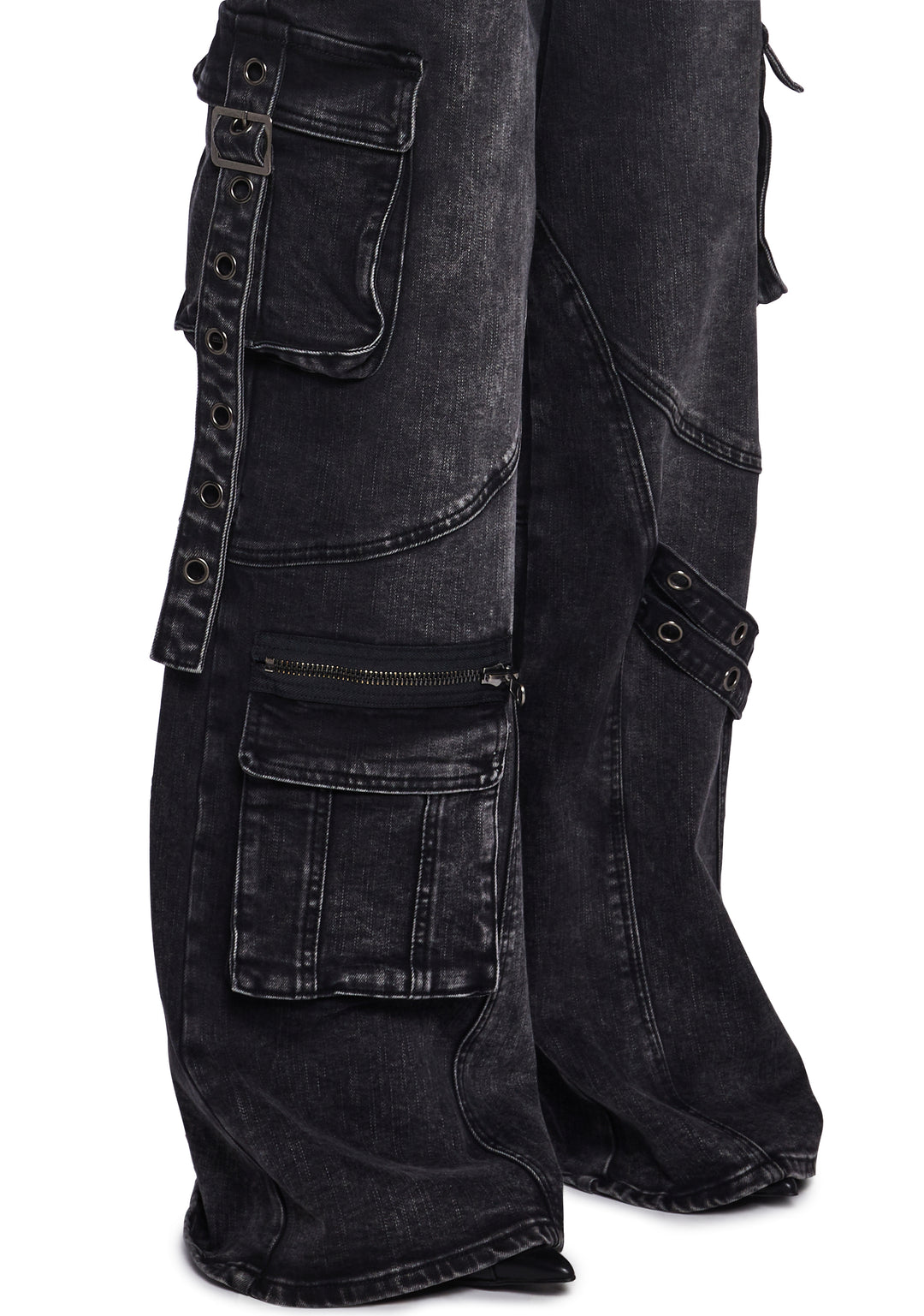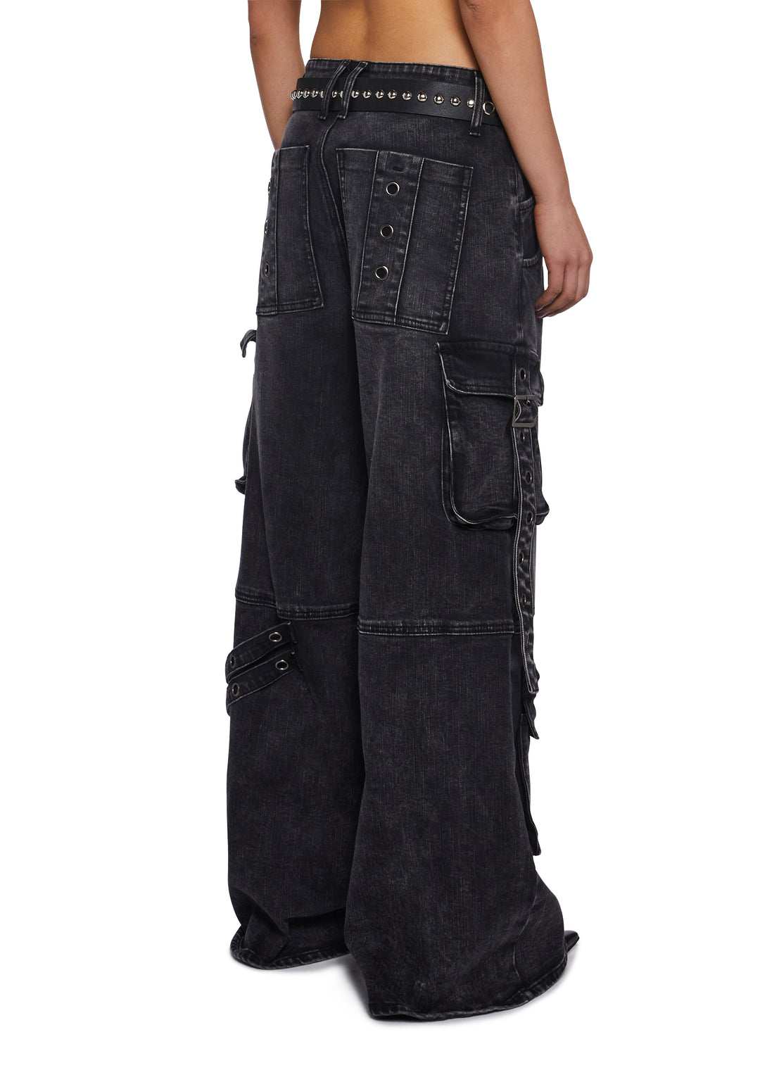 washed denim, wide legs, side cargo pockets – one with flap and one with buckle closure, one front pocket with flap closure and decorative zipper, side pocket with strap grommet detailing, four front pockets, front zipper dual button closure, back pockets with grommet detailing