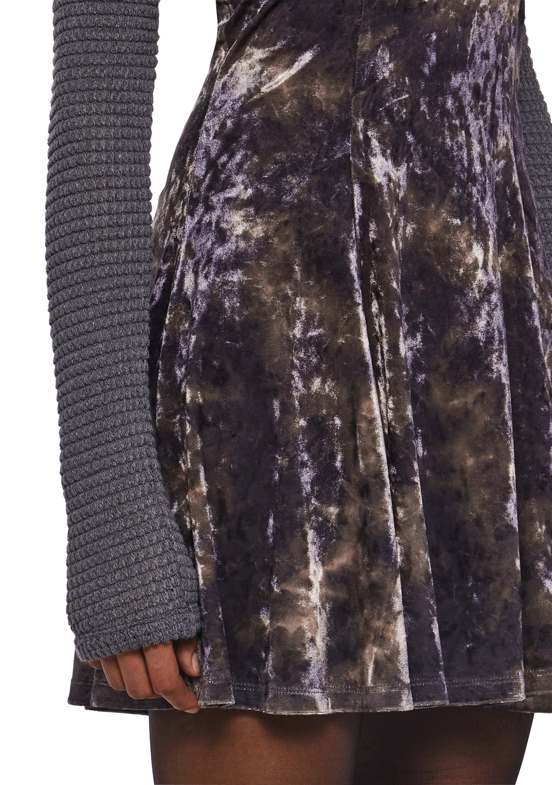 This mini dress has a chunky waffle knit washed bodice, a round neckline, long sleeves, and a velour skirt.