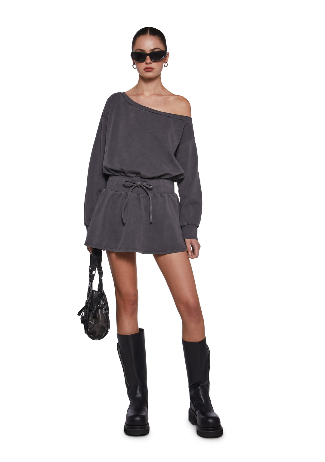 This dress has a washed cotton construction, an oversized fit, an off the shoulder design, a fleece lining, long sleeves, and a decorative bow on the front.