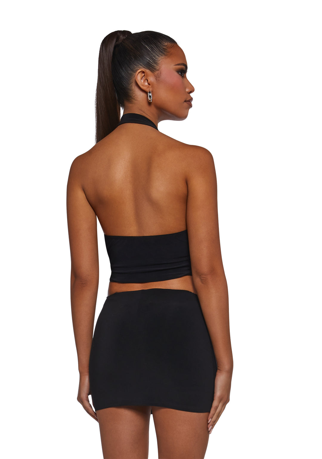 Wow them with this skirt set that includes a top that has a deep cowl neckline, ruching, an adjustable halter neckline, and a matching skirt set.
