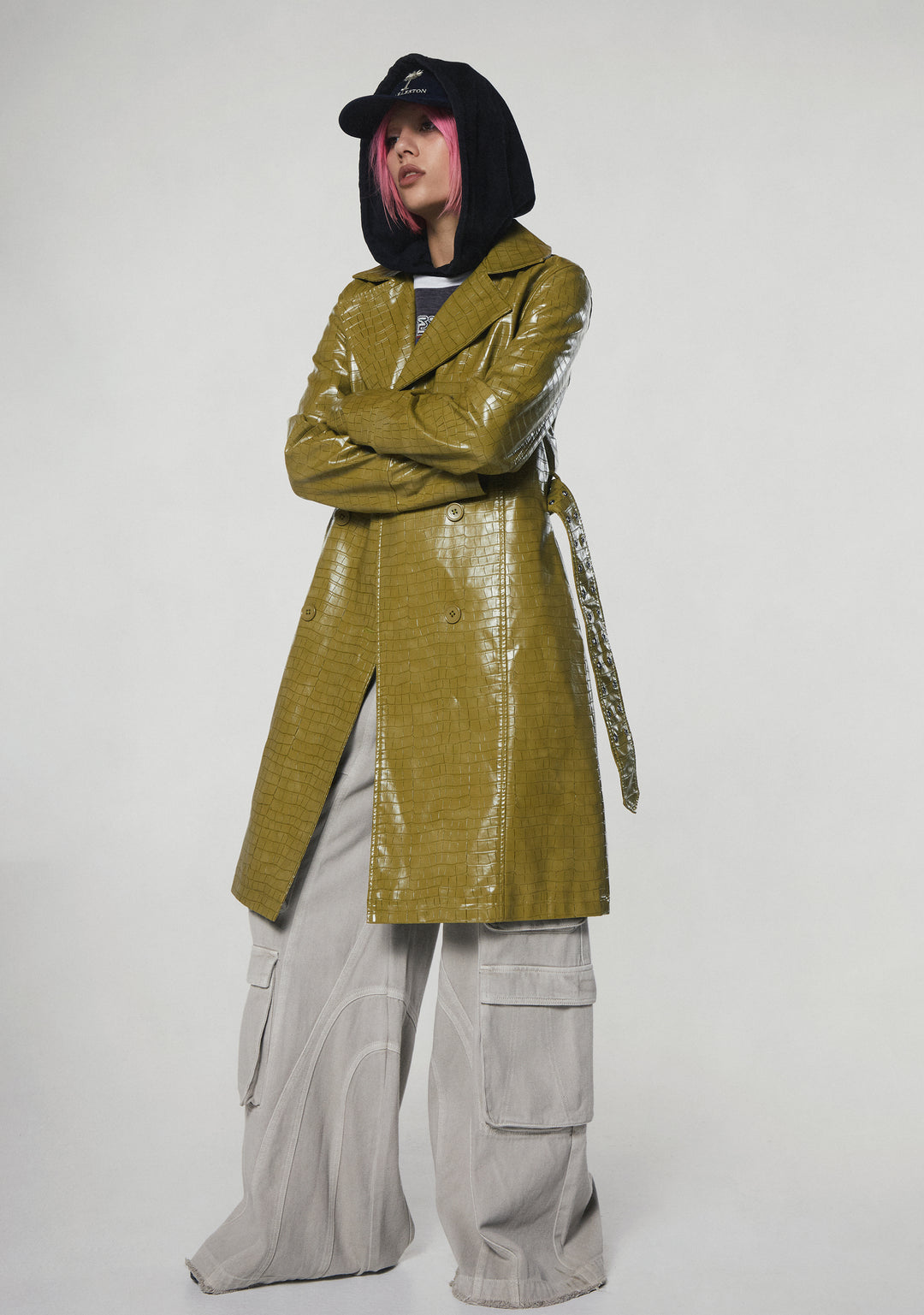 You’ll be their number one with this trench coat that has a vegan leather construction, a crocodile pattern, a notched lapel collar neckline, side pockets, button closures, and an adjustable belted waistline.