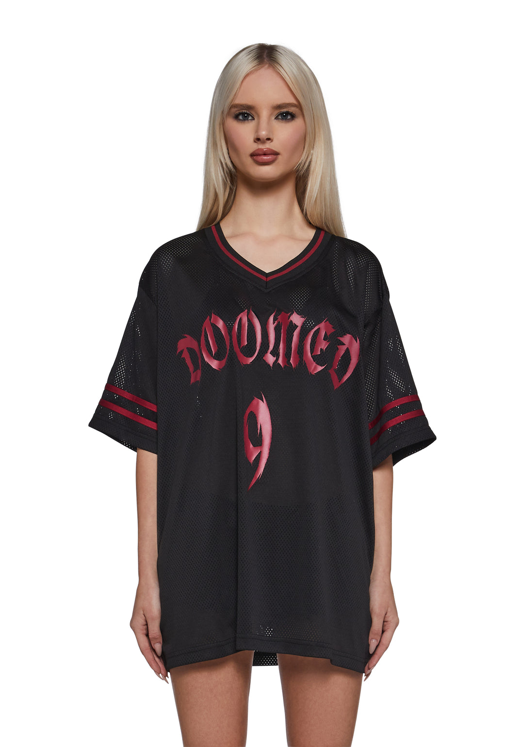 This jersey inspired tee has a semi-sheer mesh construction, a v-neckline, a striped trim, short sleeves, an oversized fit, and the number 9 and ??Doomed?? printed on the front.