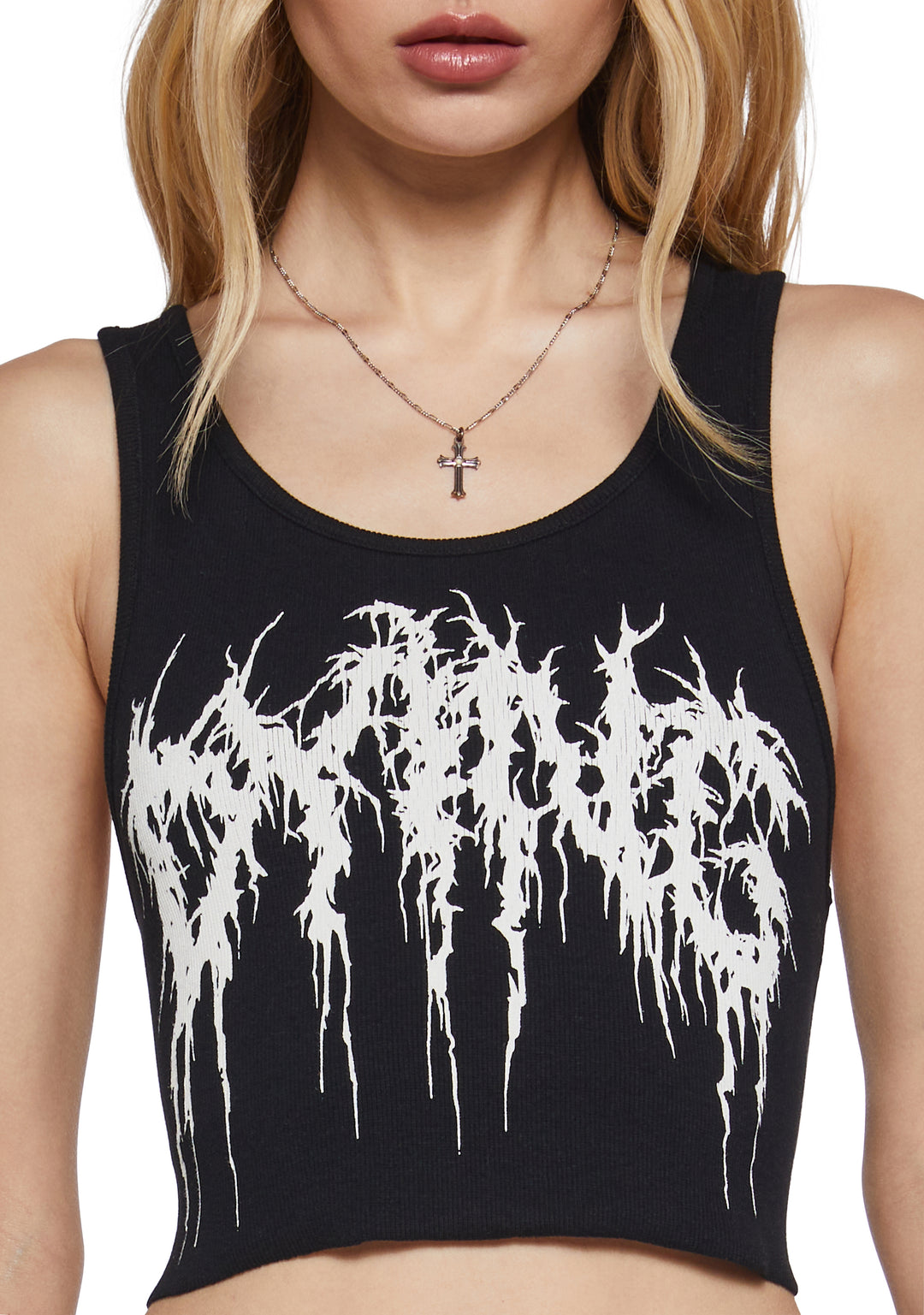 This tank top has a ribbed construction, a raw hem, a cropped fit, and ??Dying?? printed on the front.
