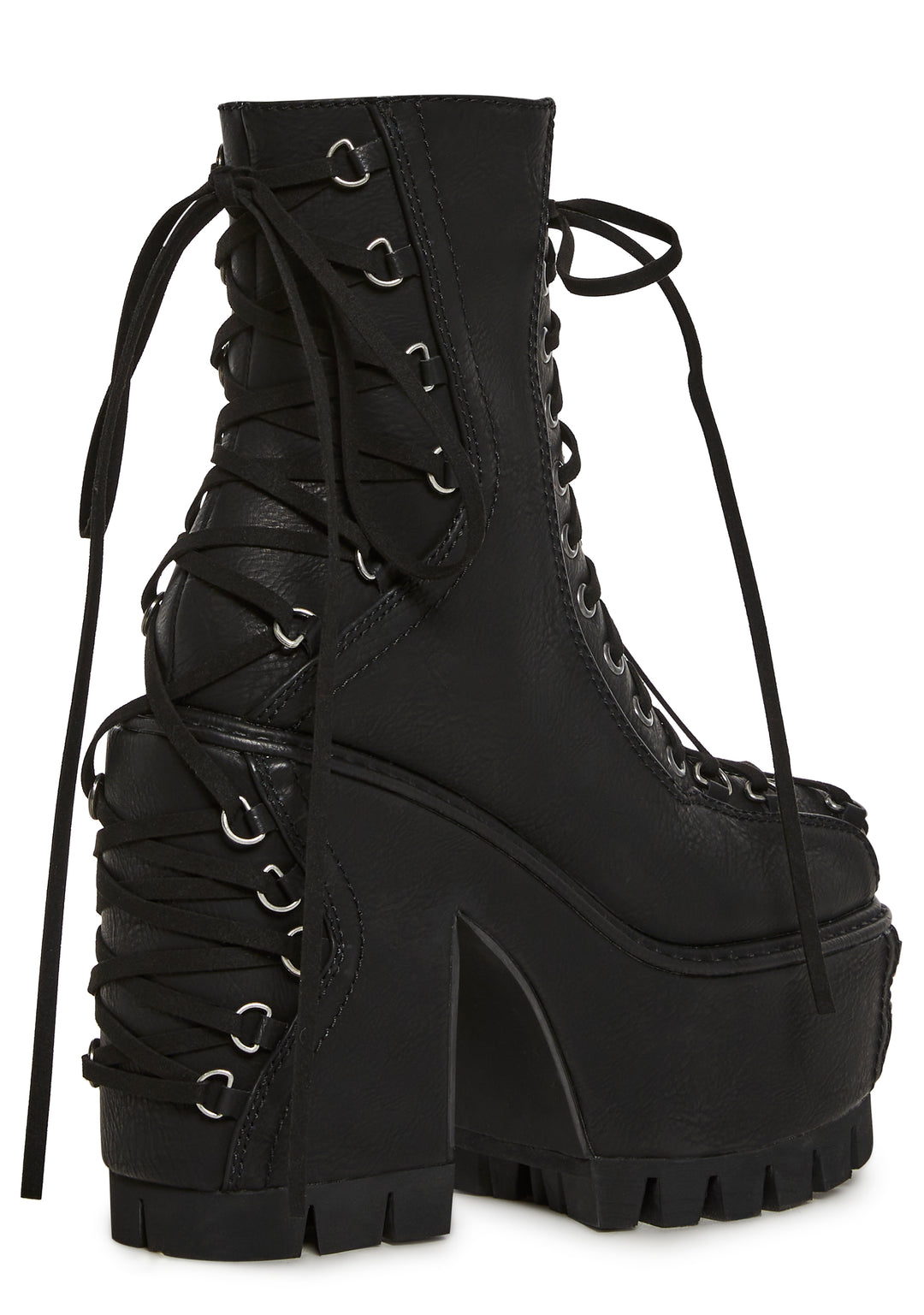 These boots have a textured vegan leather construction,treaded platform soles, block heels, a lace-up design on the front and back, and side zipper closures.