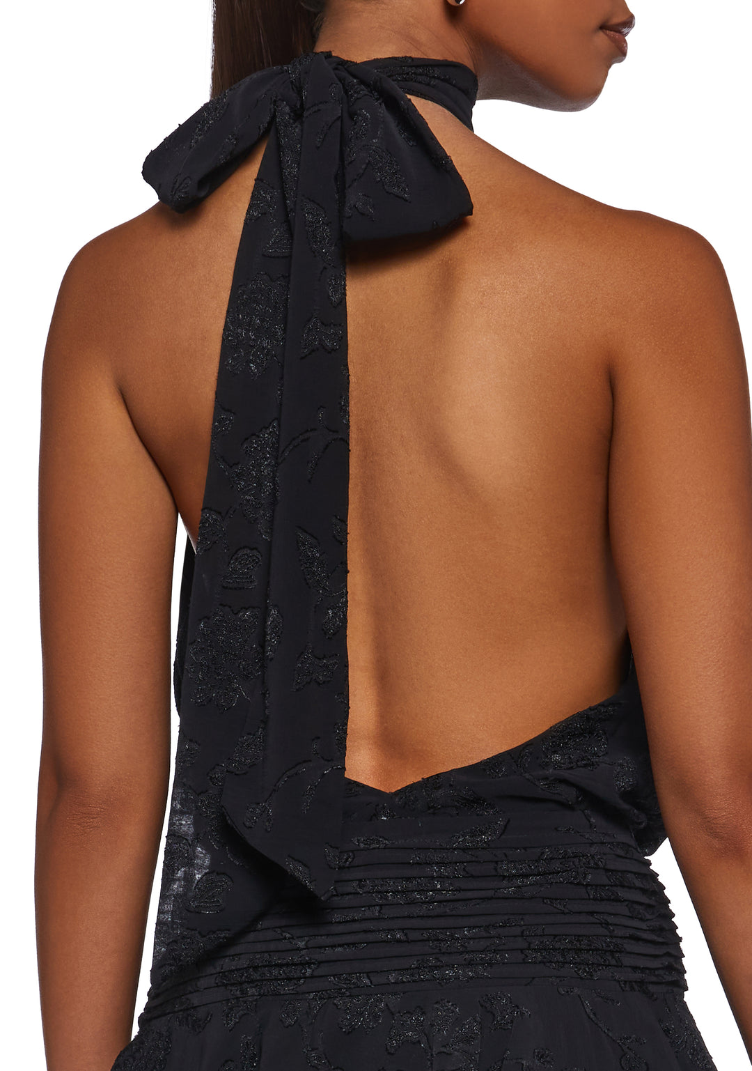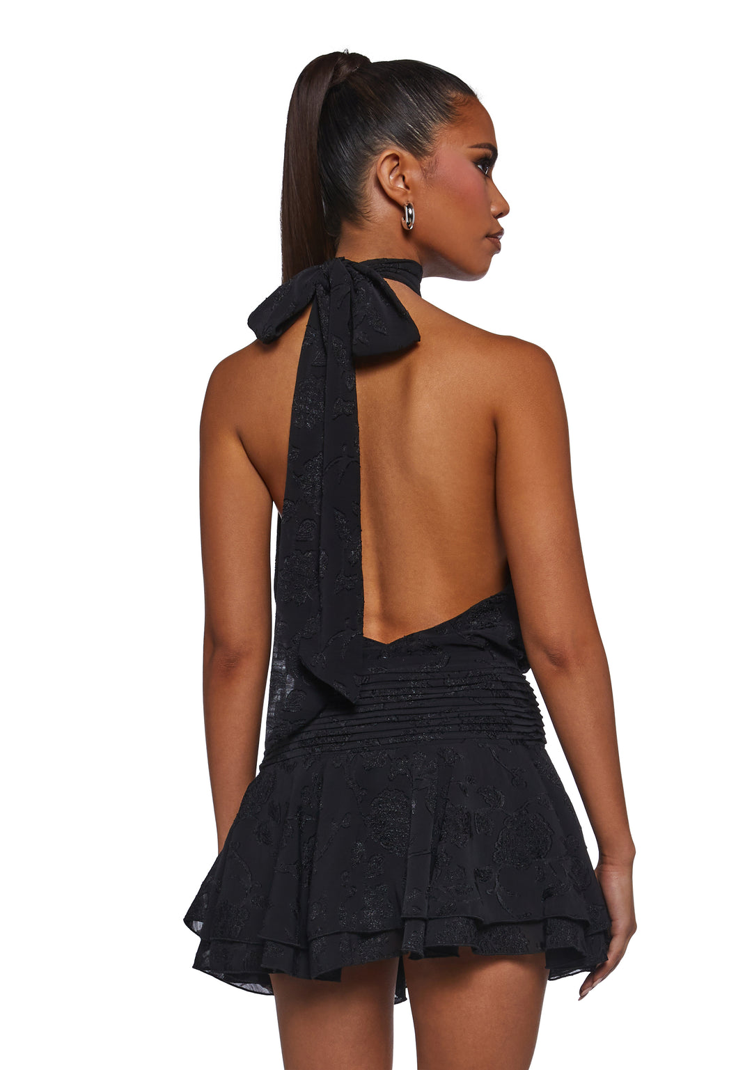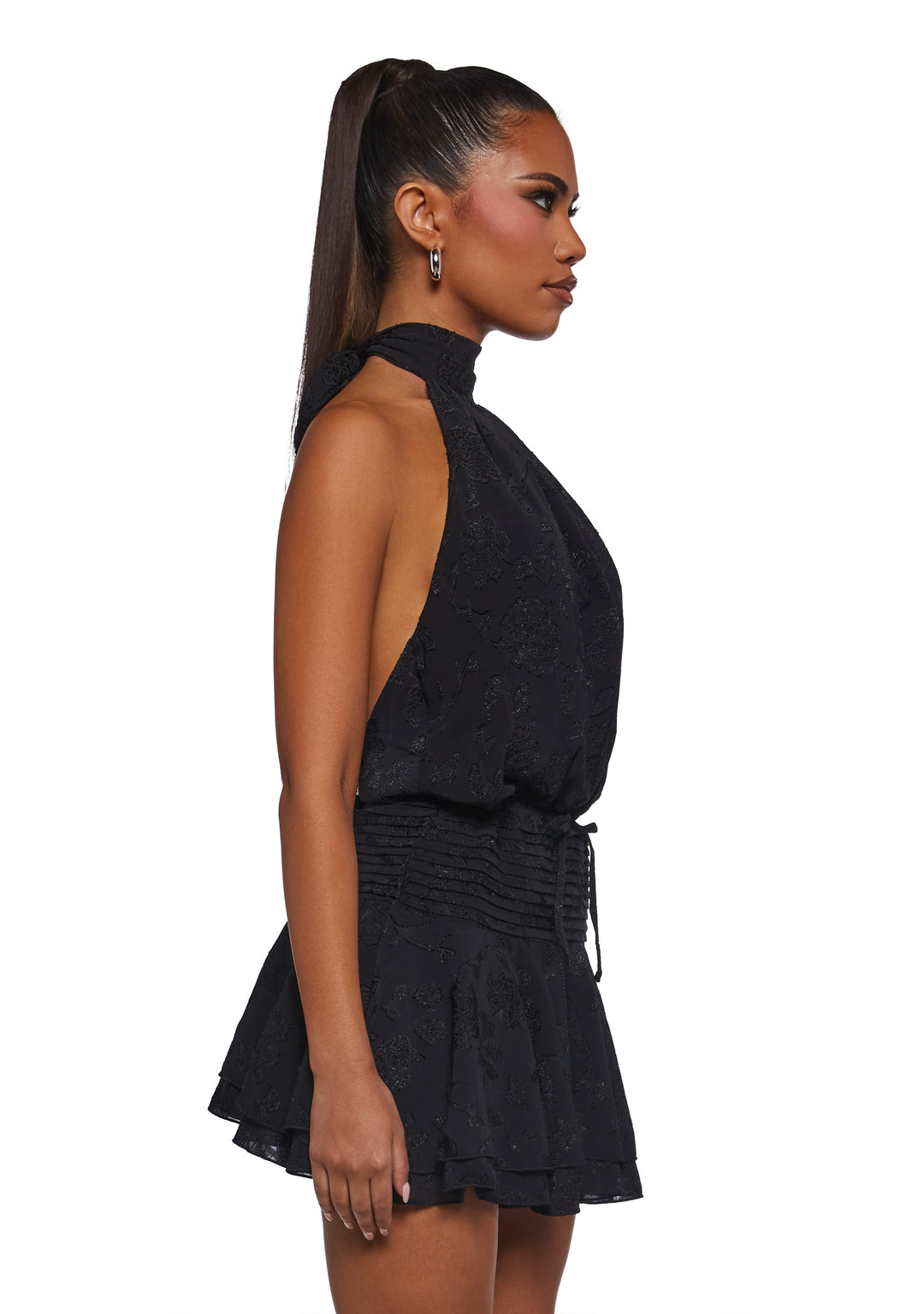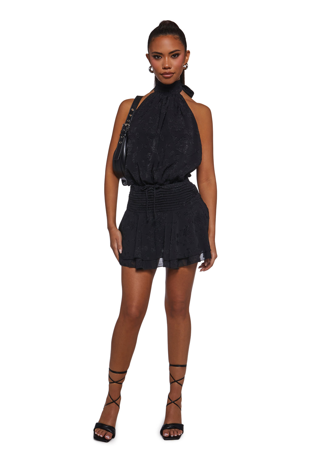 This black halter mini dress features a soft floral embossed texture, a chic high neckline, and a flowy bodice. The ruched waist with adjustable ties creates a flattering, cinched silhouette, while the tiered mini skirt adds movement and charm. The open back tie closures gives it a modern, sultry touch, making it perfect for nights out or special occasions.