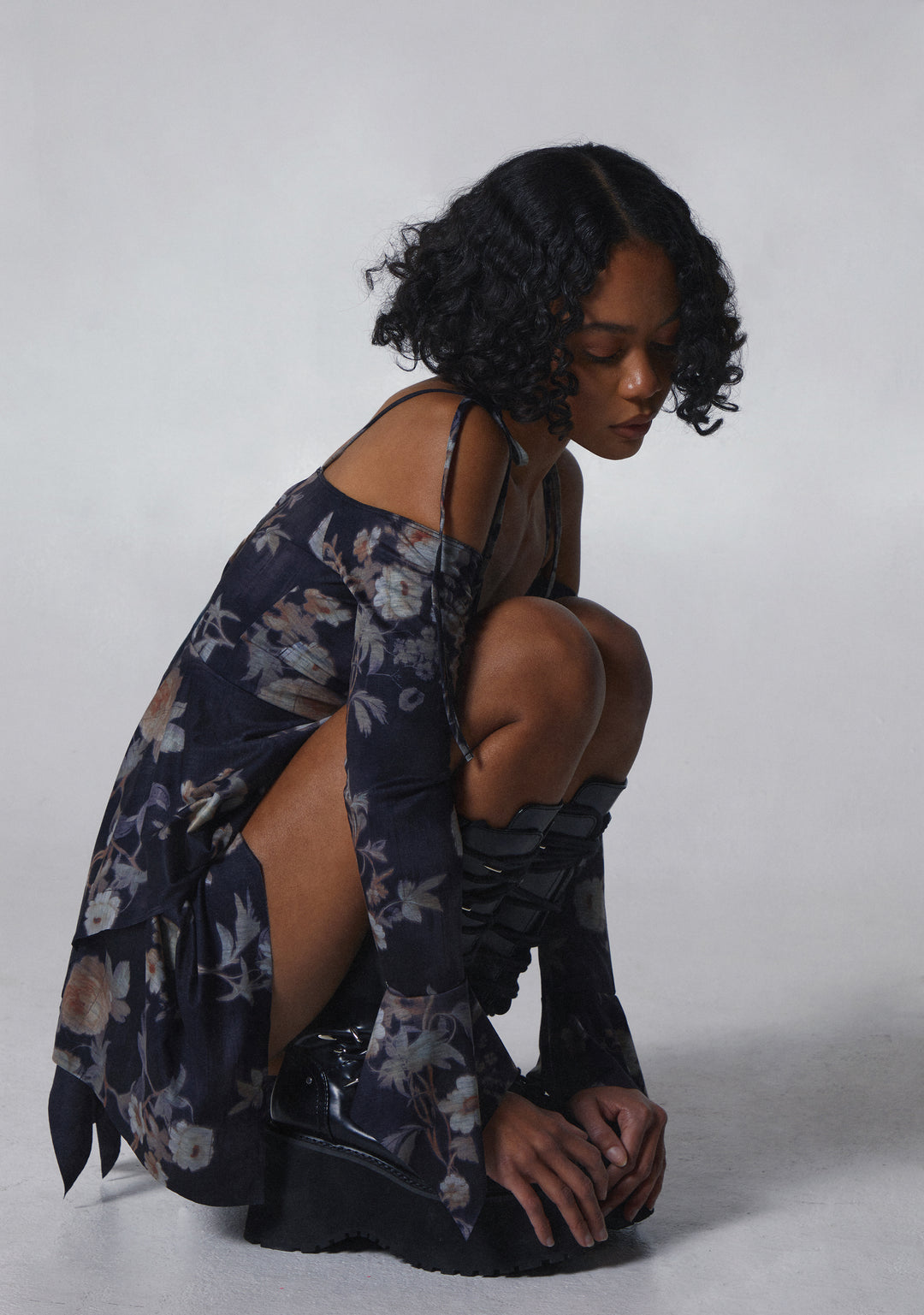This mini dress has a stretchy knit construction, a lined bust, an all over floral print, spaghetti straps with tie closures, ruching at the chest with a tie closure, and a handkerchief hem.