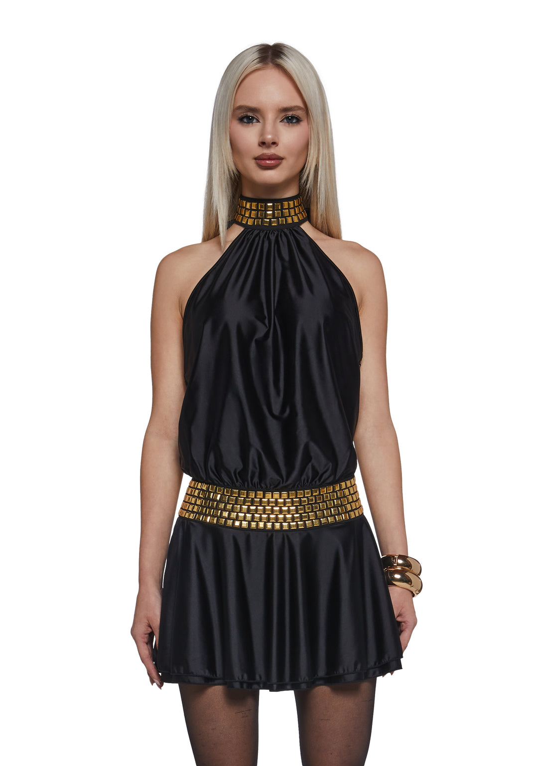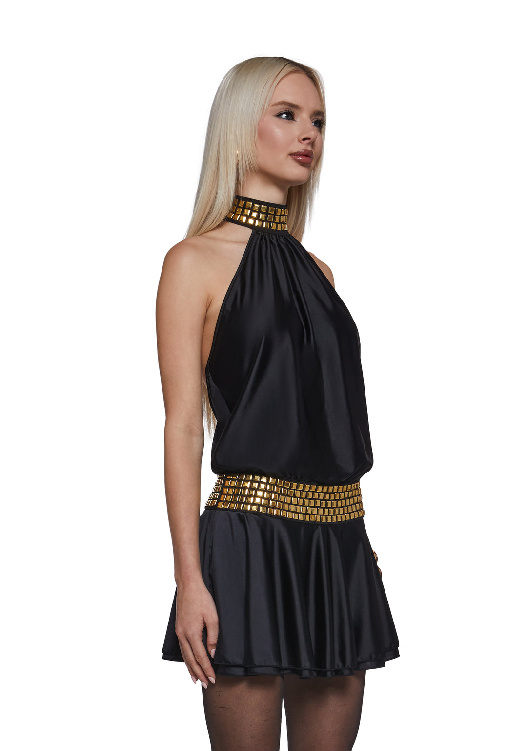 Shine like the goddess you are with this mini dress that has a stretchy satin construction, a halter neckline with gold studs on the neckline, adjustable back tie closures, a bubble hem, and gold studs along the waist.