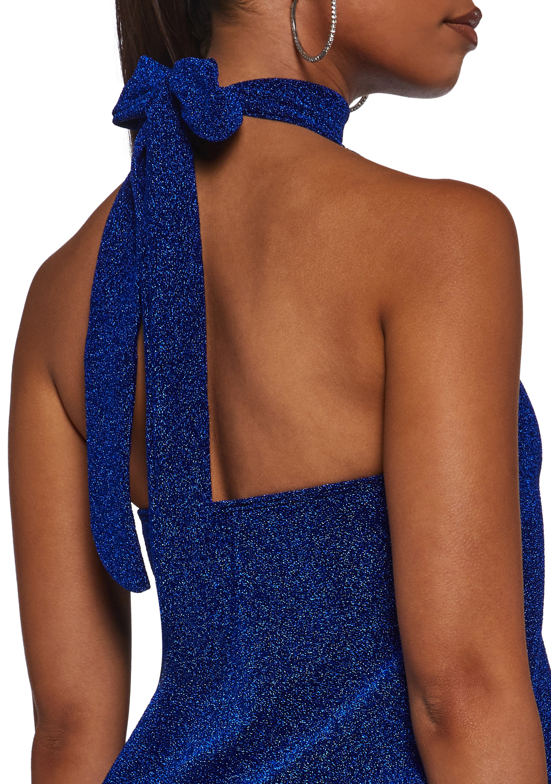 This mini dress has a glitter mesh construction and a high halter neckline with adjustable back tie closures.