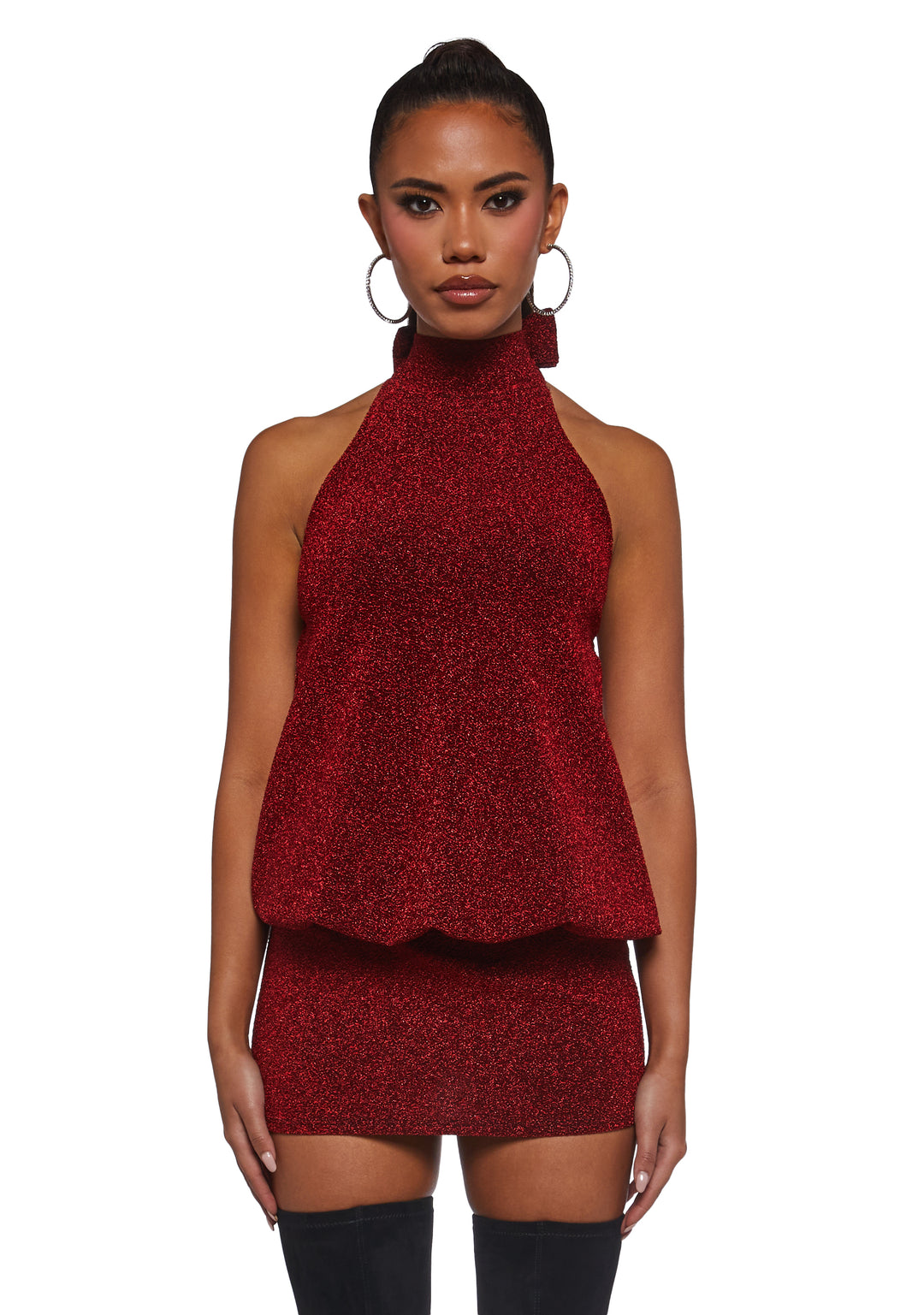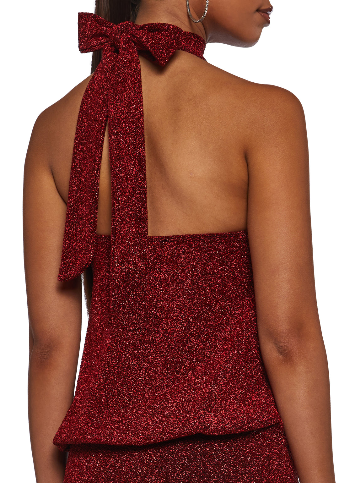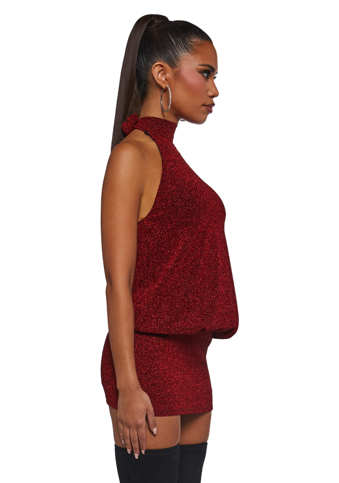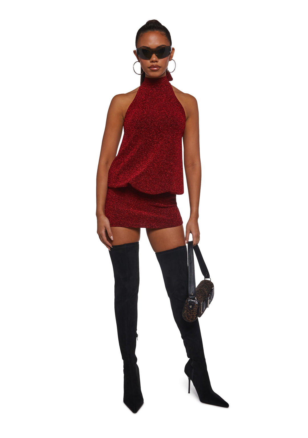 This mini dress has a glitter mesh construction and a high halter neckline with adjustable back tie closures.